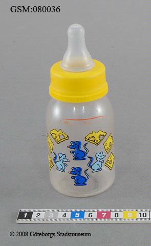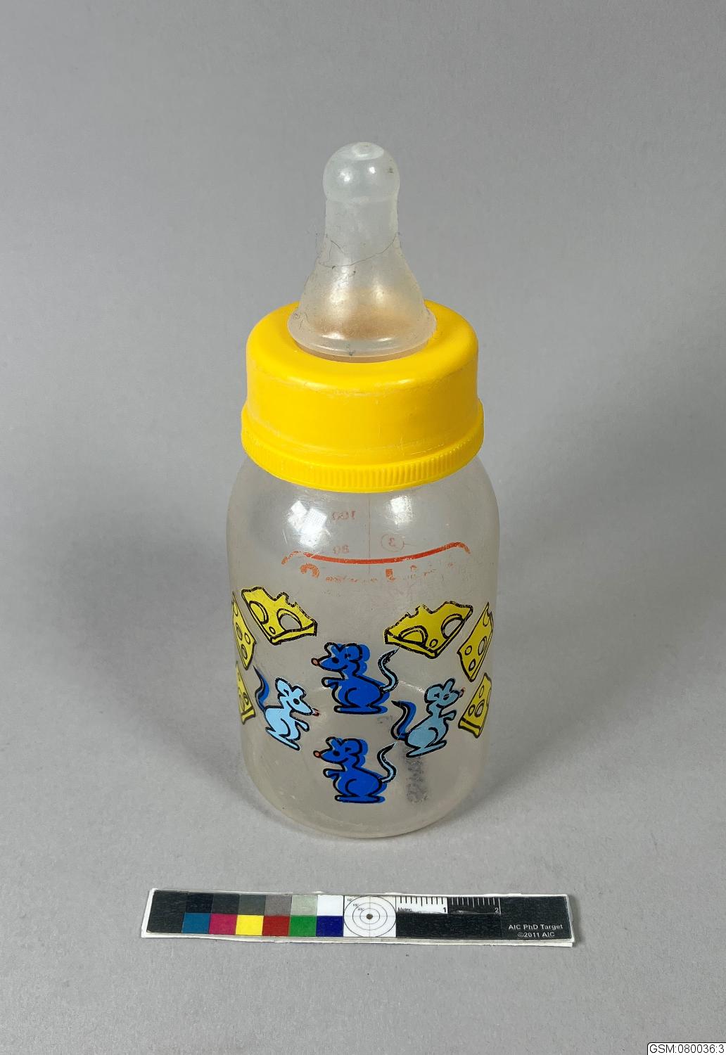 • genomskinlig plastflaska med gul skuvkork för att placera utbytbara nappar