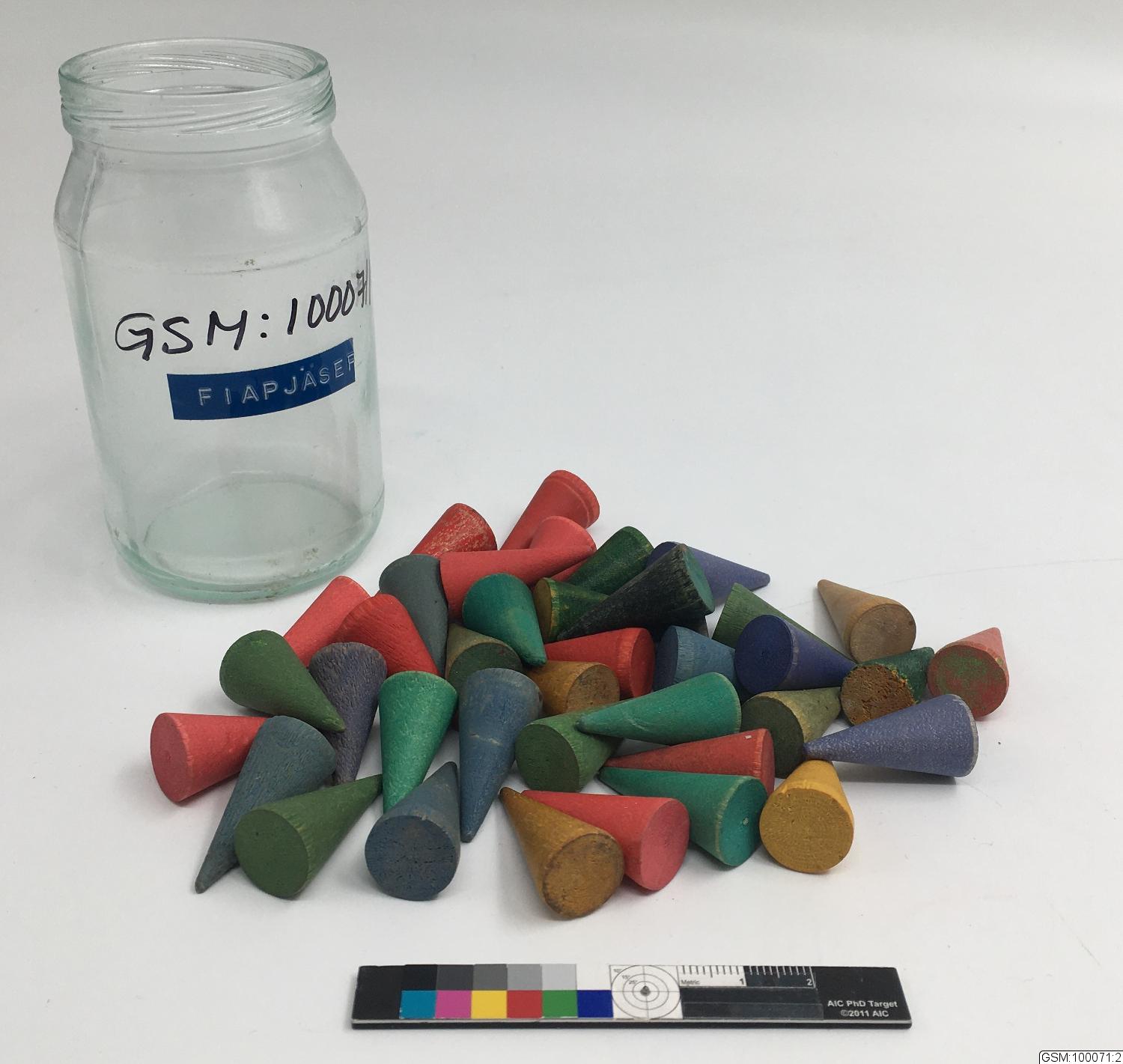 • 39 st spelpjäser, koniska, trä. Bemålade i rött, grönt, gult och blått.