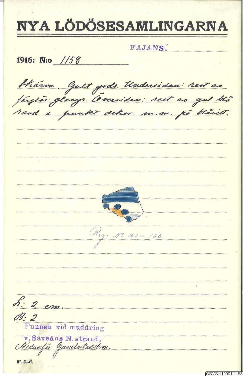 • Skärva. Gult gods. Undersidan, rest av färglös glasyr. Översidan, rest av gult samt blå rand- och punktdekor m.m. på blåvitt.