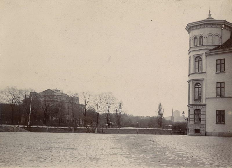 Påskrift med bläck under fotografiet: Stora Nygatan. Åt vester. Den öppna platsen vid Trädgårdsgatans mynning (platsen för den gamla bastionen). Till venster Kungsparken med Stora Teatern, i midten omnibusstation till Mölndal, till höger Hagakyrkan och Skansen Kronan, samt till höger i förgrunden en del af hörnhuset 12 o 29 (tomtnr 41 i VII qvart.) 1888.