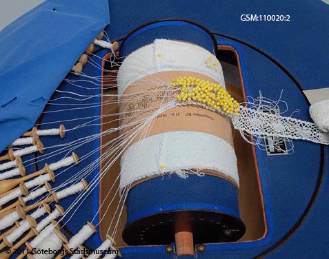 Rulle till knyppeldyna trä och metall klädd med bått tyg, metallskivor på rullens kortändar varav den ena med hål i ytterkanten för att kunna låsa rullen med en fjädrande mekanism.Själva Rullen har fått nummer GSM:110020:2:1 Det vita skyddstyget under mönstrer nummer GSM:110020:2:2 och det bryna skyddstyget under det vita skyddstyget har fått nr GSM:110020:2:3 skyddstygen har inte mätts eller på annat vis undersökts då det skulle innebära att den pågående spetsen måste lossas varefter den med stor Sannolikhet inte går att återplacera i sin nuvarande positionStäng