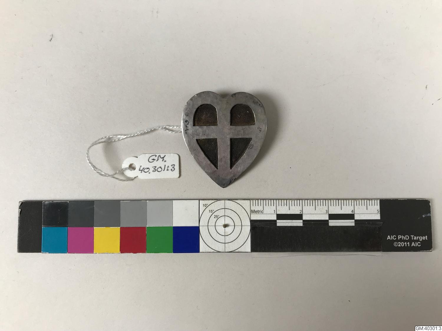 Brosch av hammrat silver: kors omramat av hjärta genom hålrummen emellan syns tyg (ursprungligen lila jmf GM40302:3) fasthållet med klamrar. Stämplat på baksidan"JOHN HOFFNER","JHR", kattfot i sexkant, "U", "08". Denna brosch har tillhört en avliden kamrat till givaren. höjd 3.7cm breddd 3.3cm