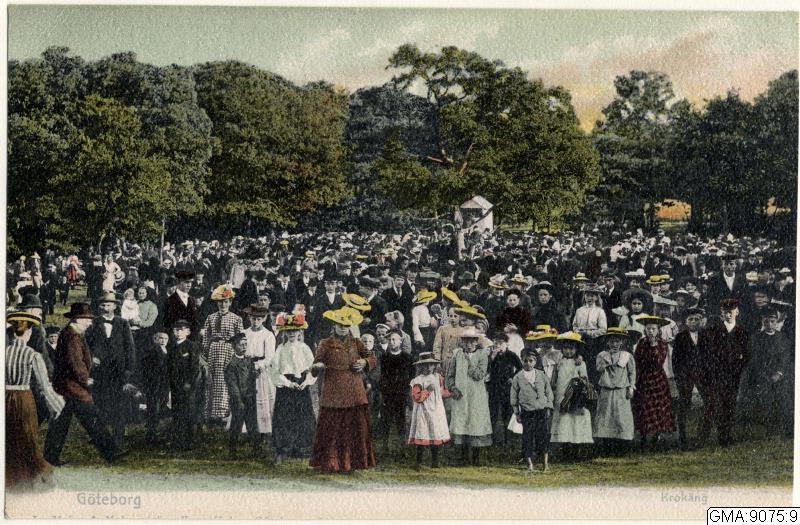 • Handkolorerad bild, uppställd folksamling. I nederkanten tryckt Göteborg till höger och Krokäng till vänster