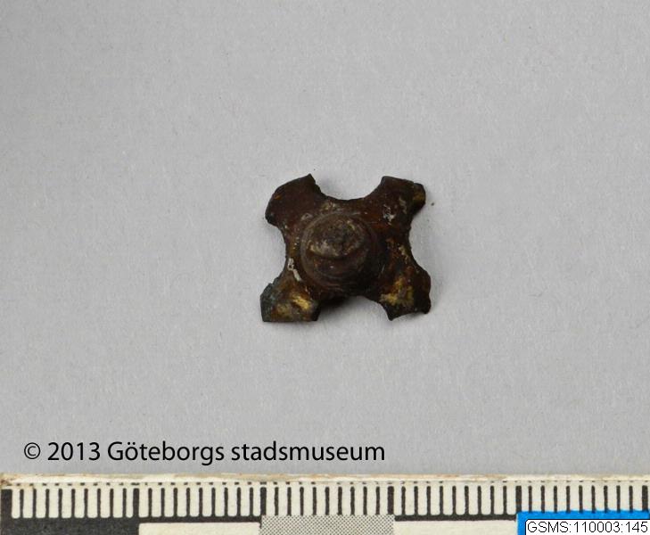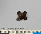 • "Bronsbeslag. 1.4 x 1.2 cm, h. 0.7 cm." [enl. katalogkort]