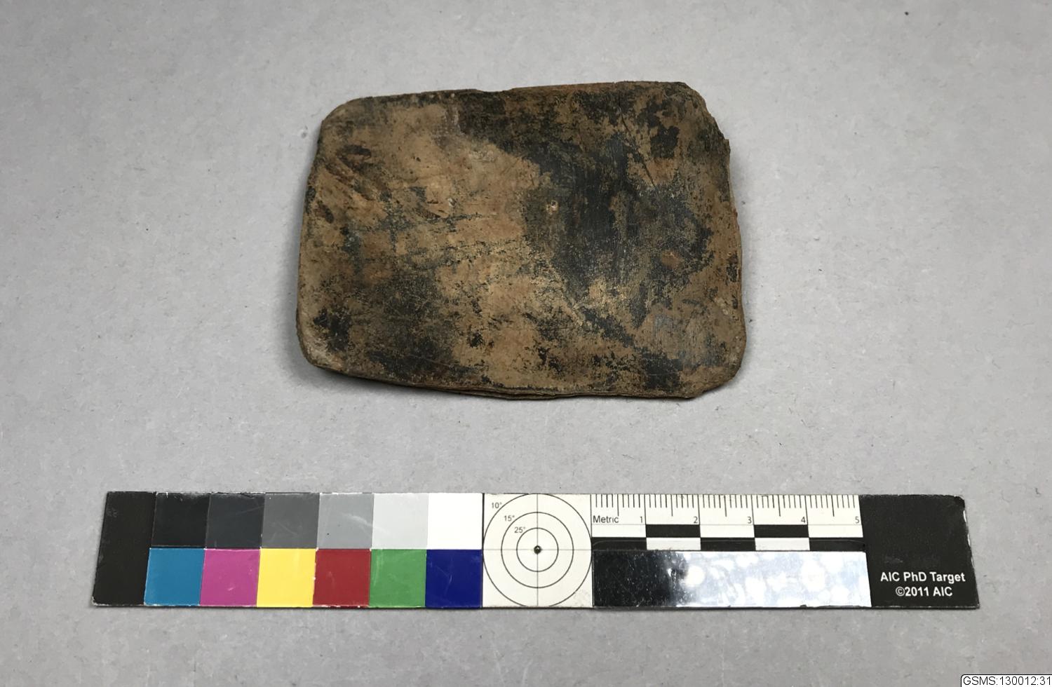 • en bit fyrkantig, platt bit med rundade hörn. Av läder?