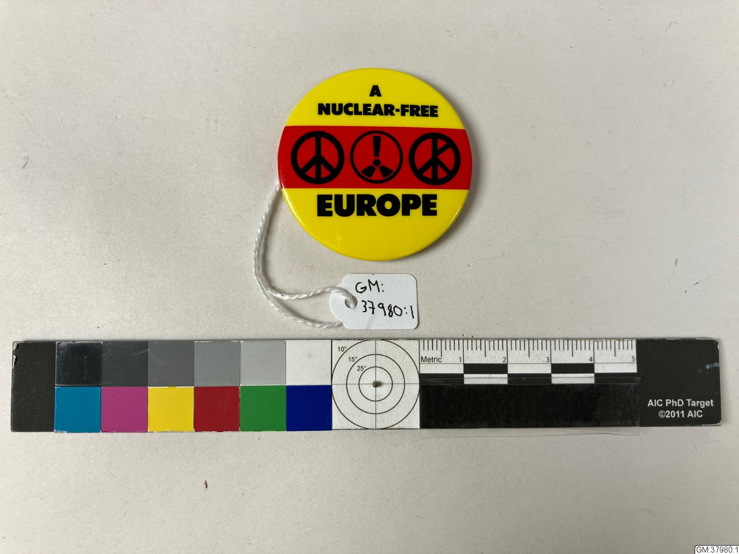 • Ett runt märke gult med svart text "A NUCLEAR-FREE EUROPE" samt ett rött band med tre cirkelrunda symboler bland annat fredsmärket.