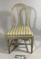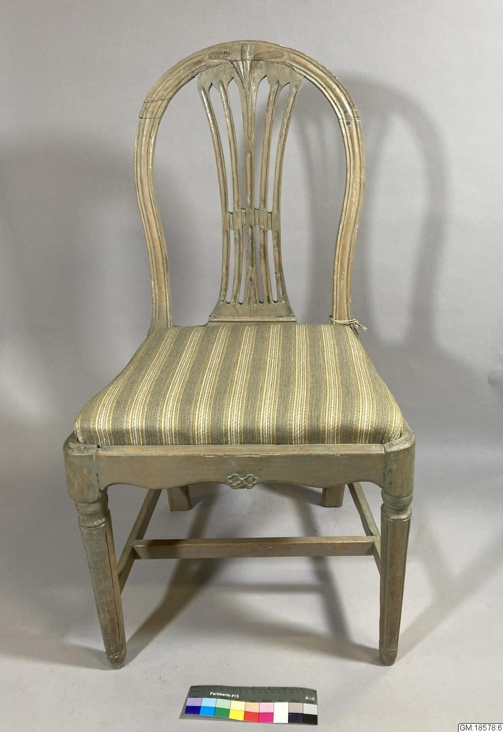 Gustaviansk stol med genombruten ryggbricka bestående av fem spjälor krönt av ett veteax. Svängd ram. Lös dyna. Klädsel ej i original (av museet tillförd). Vitt färgskikt bortskrapat till en mer ursprunglig grå färg.
