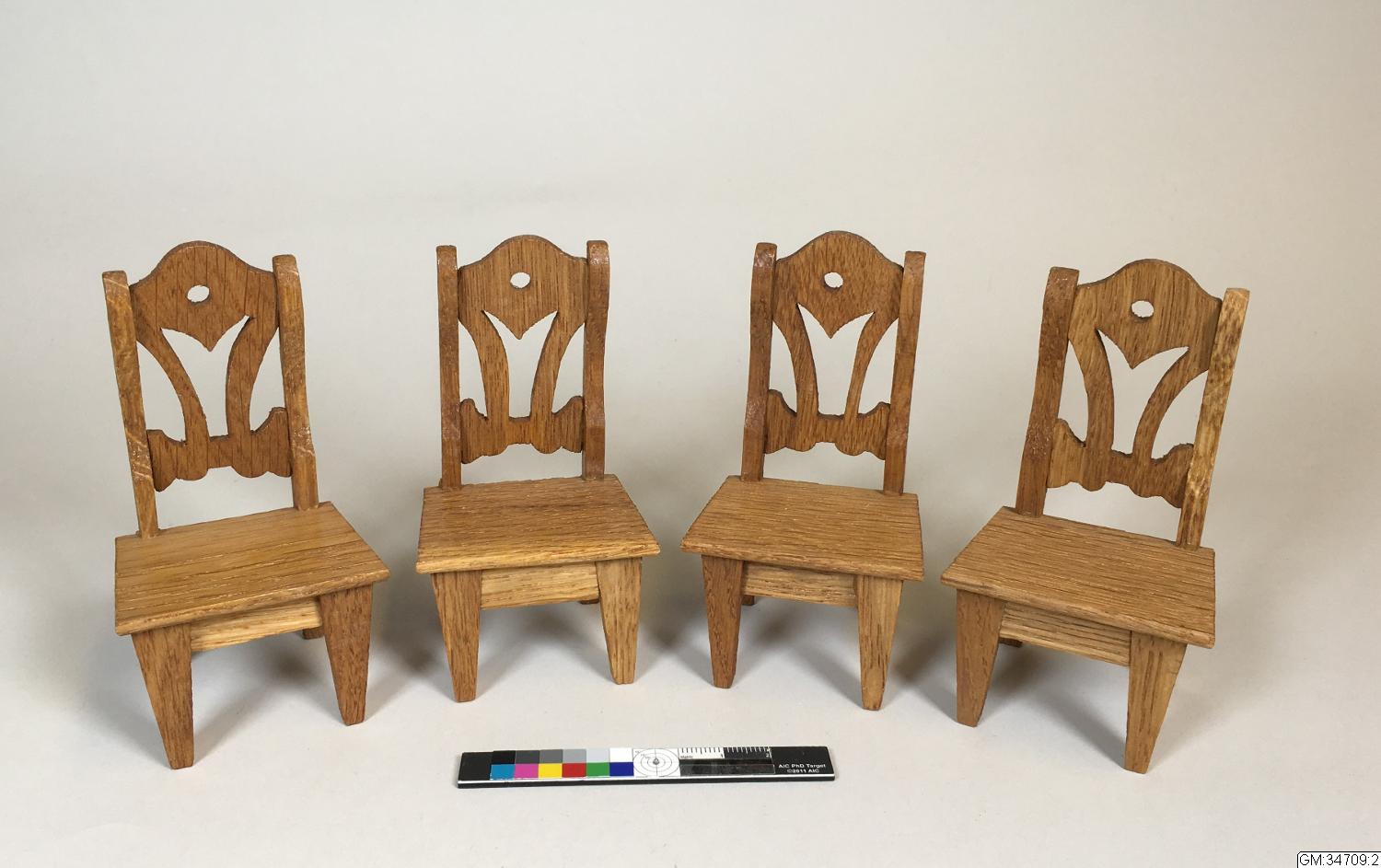 • Fyra stycken dockskåpsstolar av ljust betsat cederträ med nedåt avsmalnande ben och genombrutna ryggar. (:2-5)