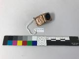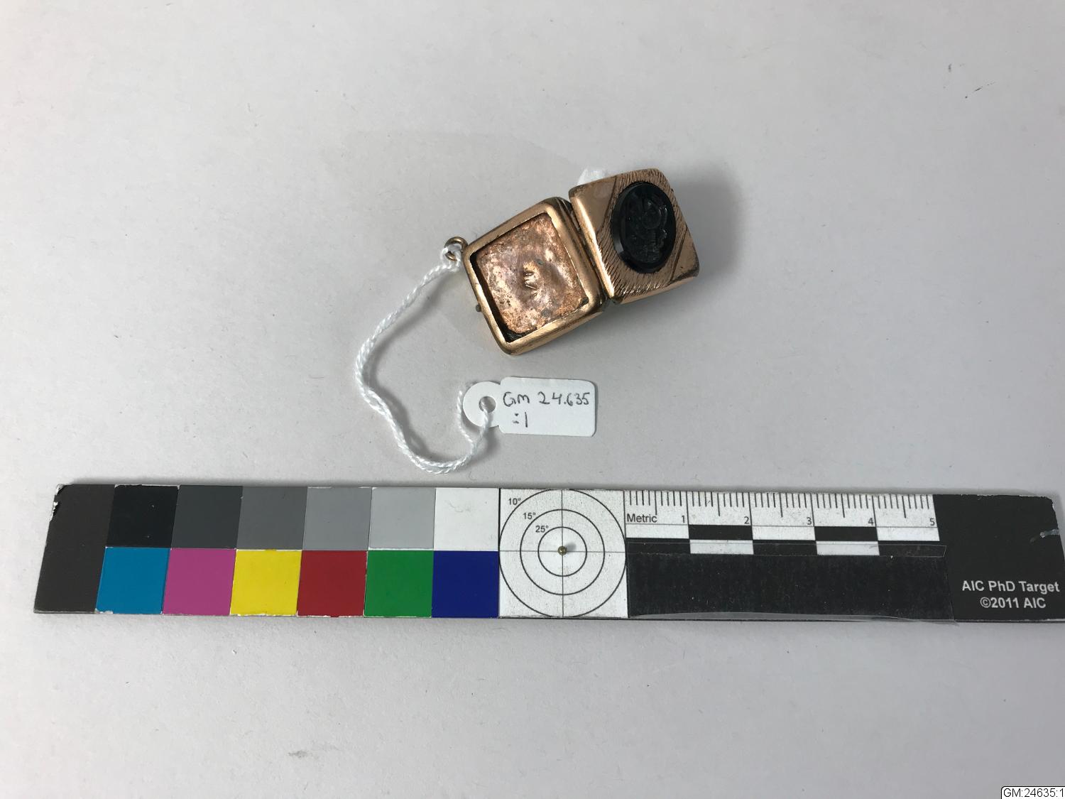 fyrkantig medaljong av gulmetall., På ena sidan en profil med hjälm, inpressad i svart material, troligen glas. detta kallas intaglio.På medaljongens motsatta sida ser det ut som något fyrkantigt har varit infattat men gått förlorat. Medaljongen går att öppna.