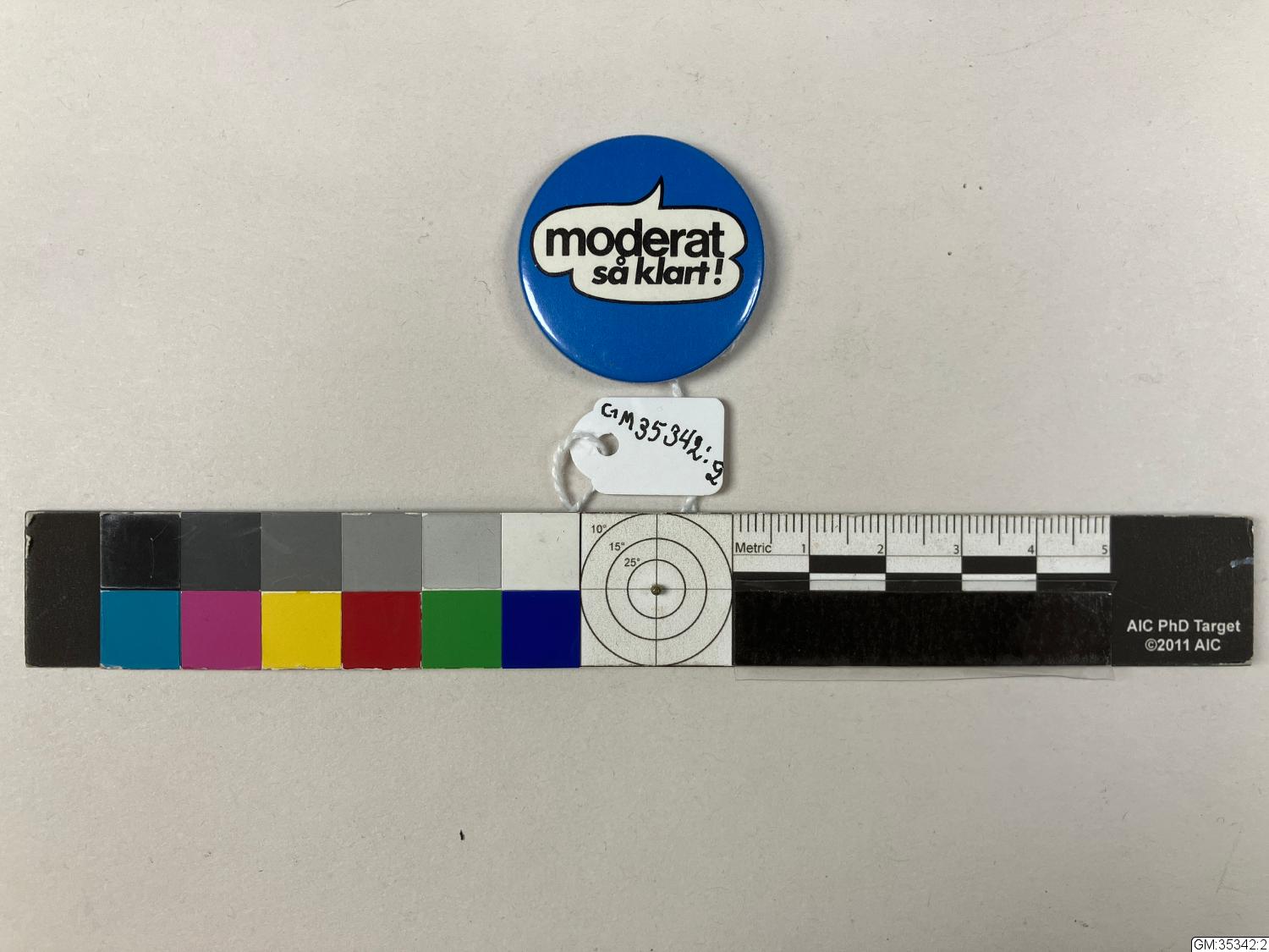 • runt blått rockmärke med pratbubbla ,med texten "moderat så klart"