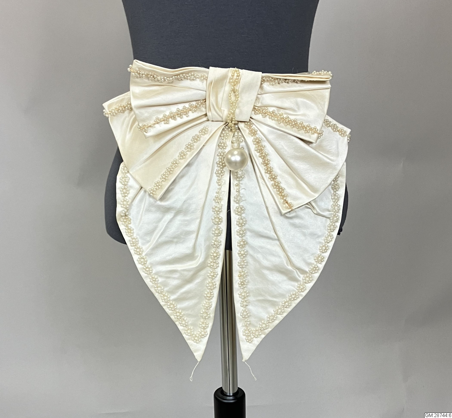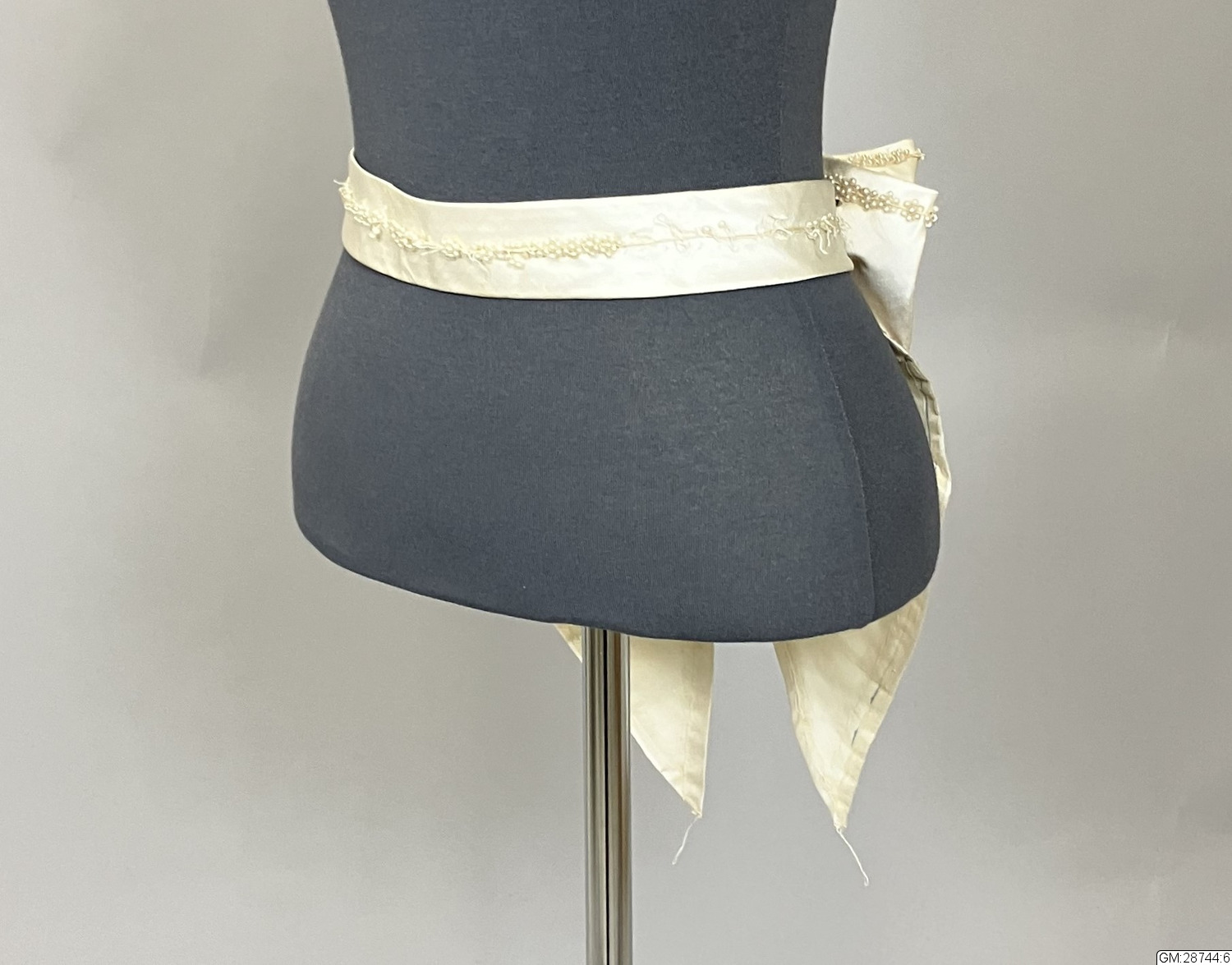 • Fabric belt with large sewn bow, made of white silk satin, decorated with extensive bead/pearl embroidery.