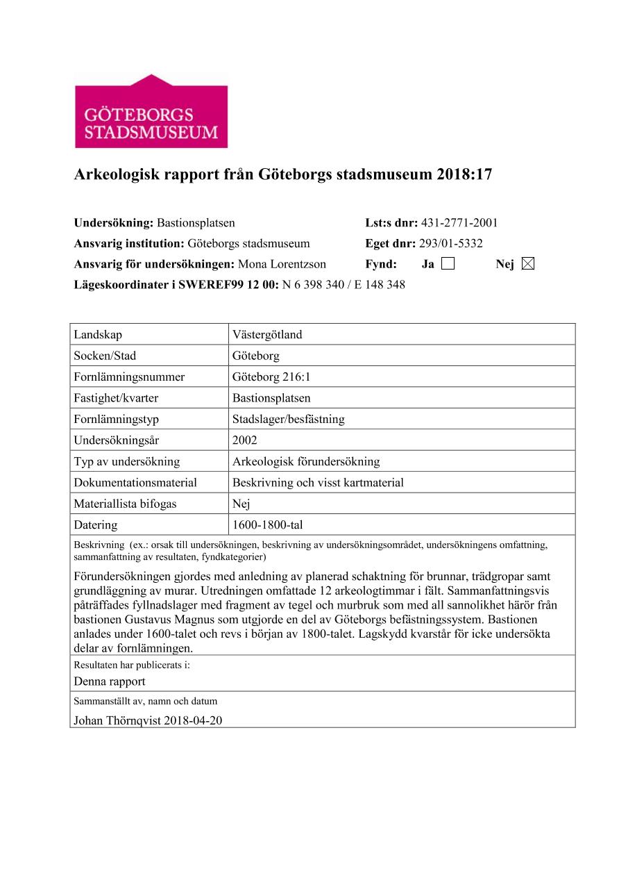 arkeologisk rapport, arkivalier, rapport, Bastionsplatsen