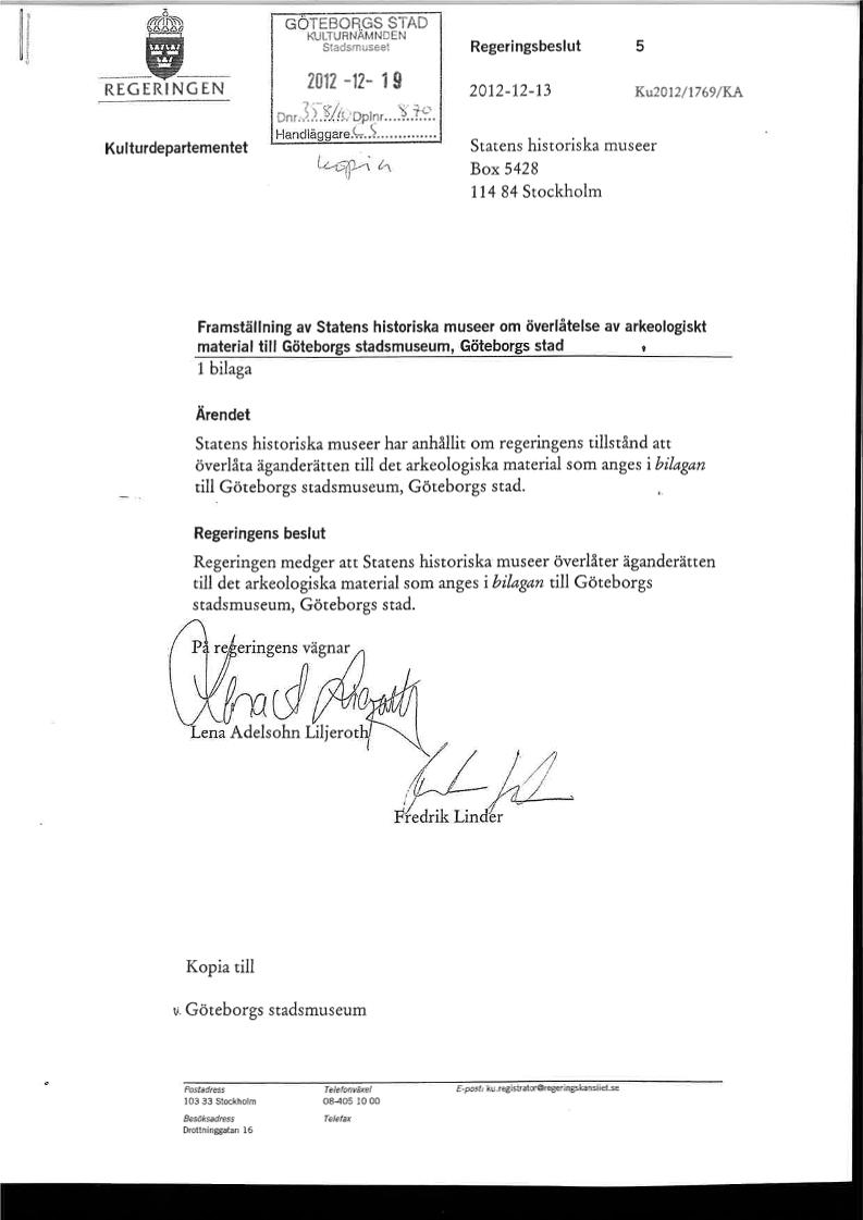 Framställning av statens historiska museer om överlåtelse av arkeologikt material till Göteborgs stadsmuseum, Göteborg stad