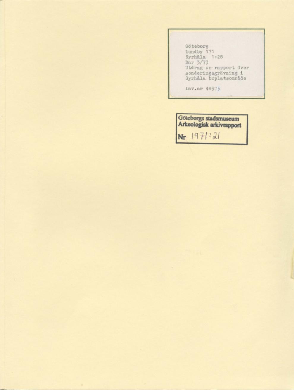 rapport, arkeologisk arkivrapport, arkeologisk rapport, Arkeologisk rapport, Syrhåla Göteborg,boplatsområde, sonderingsgrävning