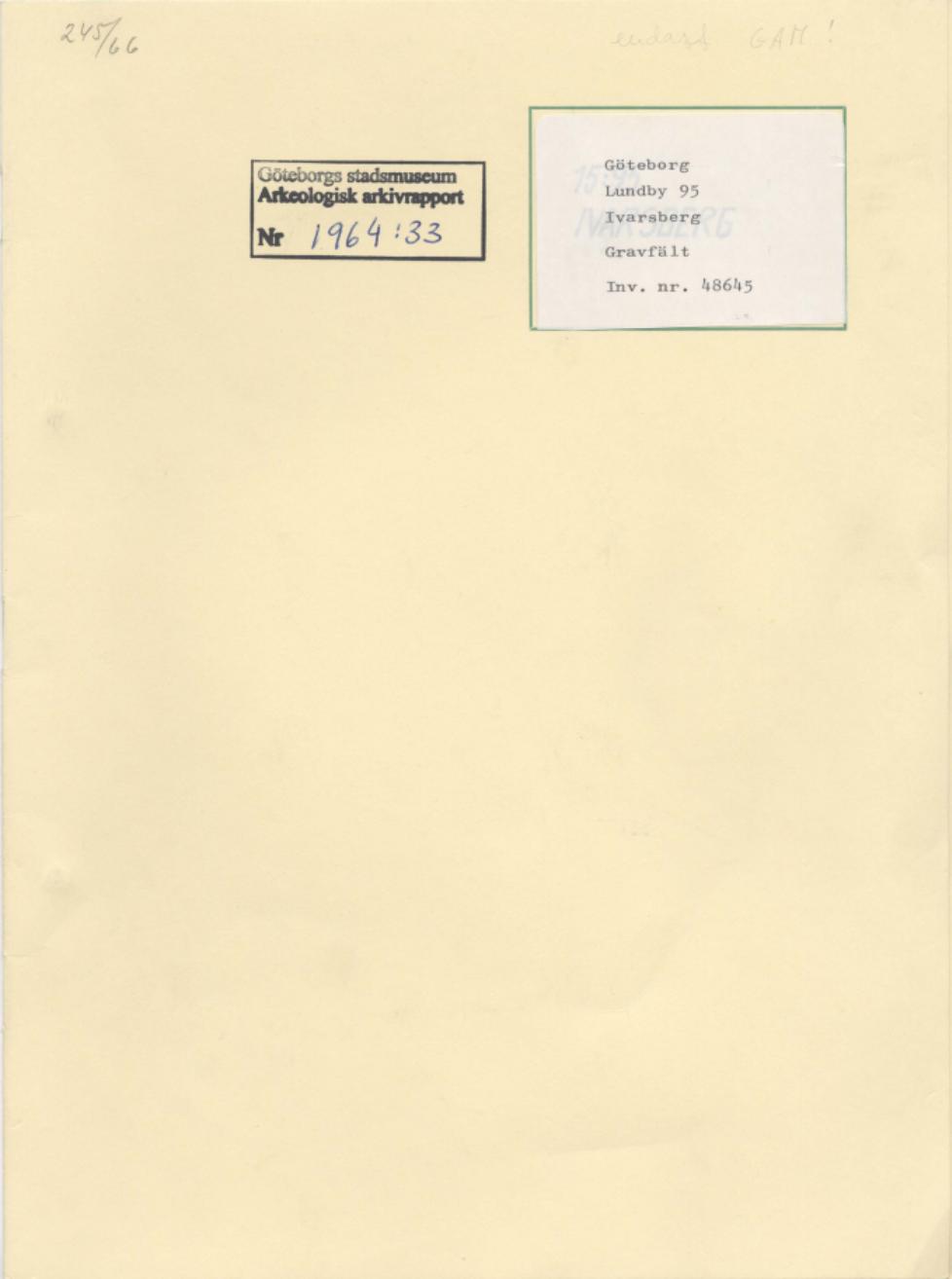 arkeologisk arkivrapport, rapport, arkeologisk rapport, fornminnesinventeringens nr 15:95 inom Göteborgs stad, Rapport över undersökning av, Arkeologisk rapport