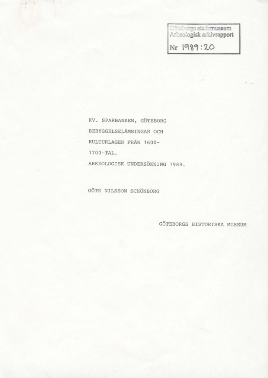 rapport, arkeologisk rapport, arkeologisk arkivrapport, Arkeologisk undersökning 1989, Kv. Sparbanken, Göteborg, Arkeologisk rapport, Bebyggelselämningar och kulturlager från 1600- 1700-tal.