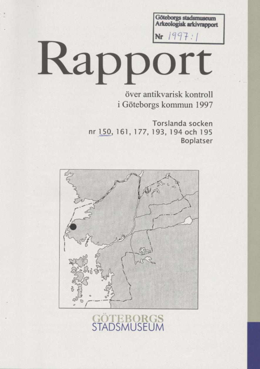 arkeologisk arkivrapport, rapport, arkeologisk rapport, Rapport över antikvarisk kontroll i Göteborgs kommun 1997 , Arkeologisk rapport, Torslanda socken nr 150, 161, 177, 193, 194 och 195, Boplatser
