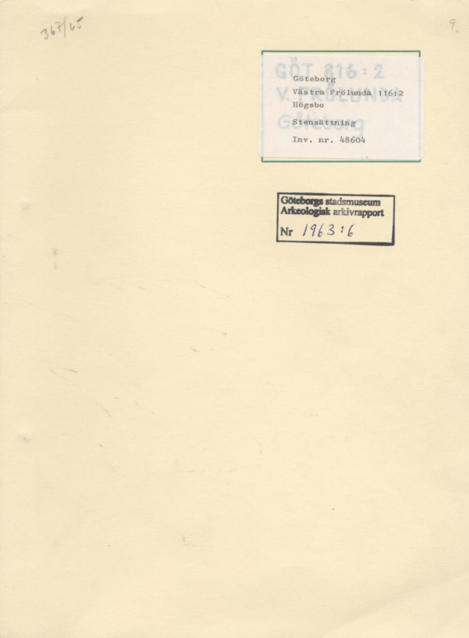 rapport, arkeologisk arkivrapport, arkeologisk rapport, Arkeologisk rapport 1963:6, Rapport över undersökning av fornlämningen Göt 816:2, inom Göteborgs stad