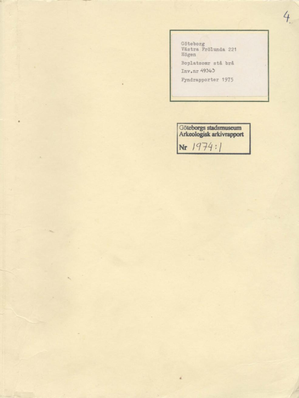 arkeologisk rapport, arkeologisk arkivrapport, rapport, Boplatsområde, stenålder, bronsålder, Högen Västra Frölunda 221, Arkeologisk rapport 1974:1
