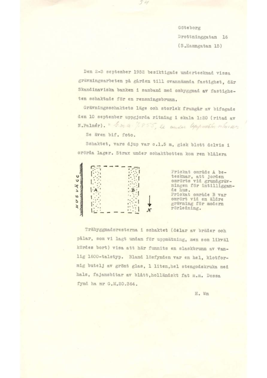 rapport, arkeologisk arkivrapport, arkeologisk rapport, Göteborg, Drottninggatan 16 (S. Hamngatan 15), Arkeologisk rapport 1952:1