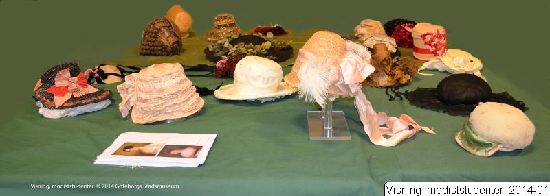 Visning av 20 damhattar tidsmässigt från 1800 talets början till omkring 1925. Ansträngningar gjorda att även få en material och teknikmässig spridning på de hattar som presenterades. Visningens gjordes för studenter och en lärare från modistutbildningen vid tillskärarakademin i Göteborg. Samtliga studenter fick söka i museets databas efter hattarnas registerposter,de uppmanades också att ställa frågor. Visningen ägde rum i magasin A.Stäng