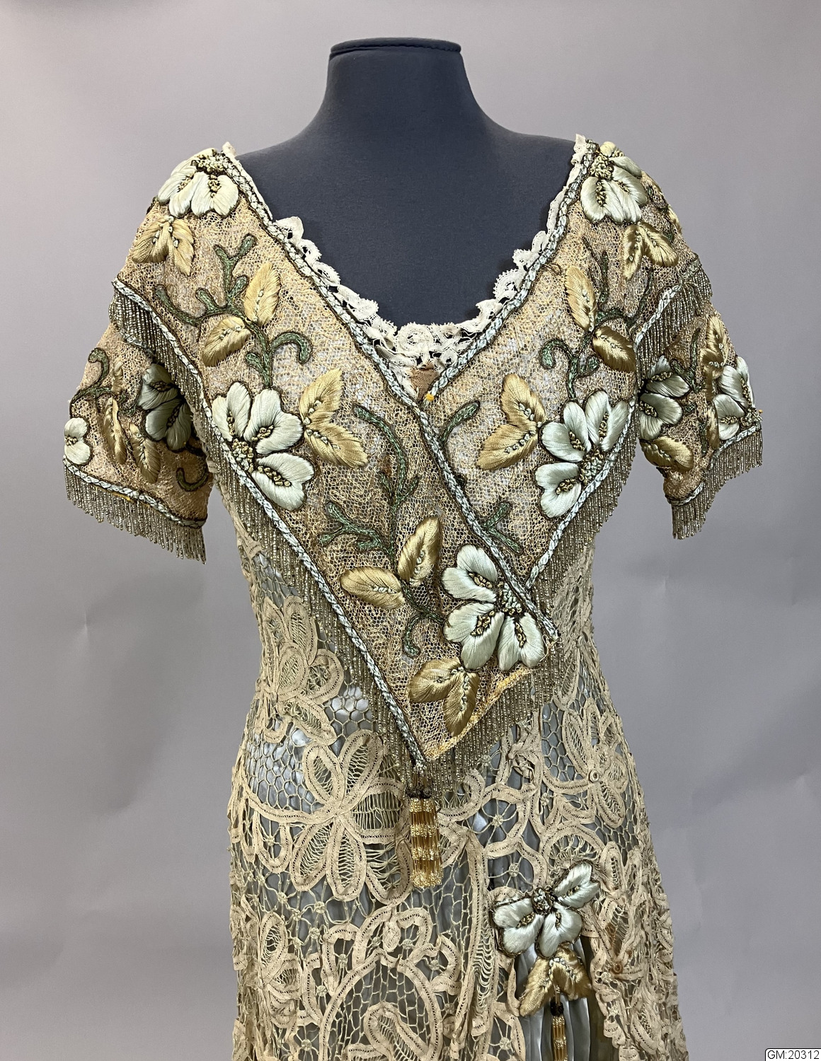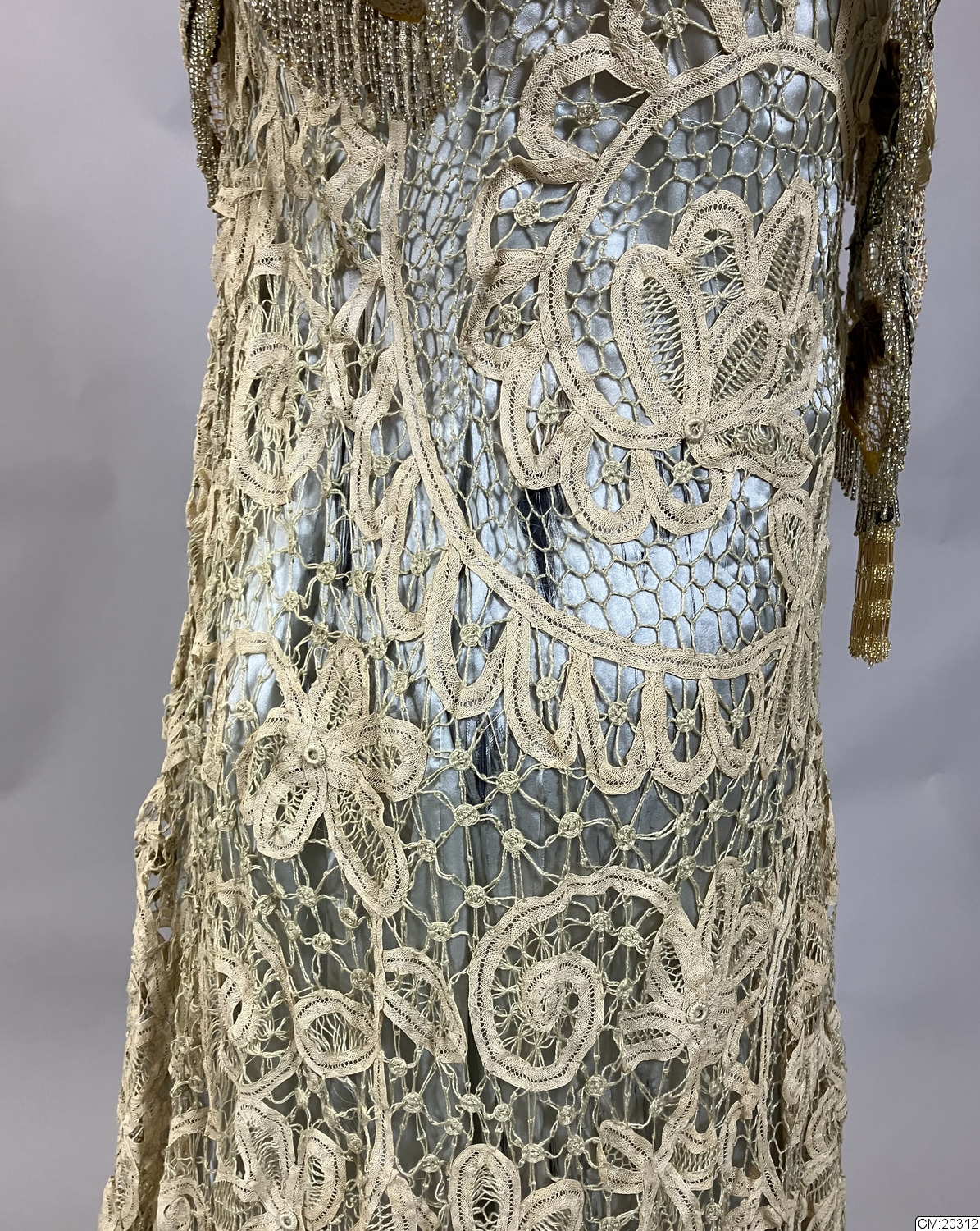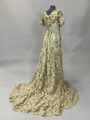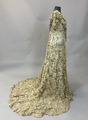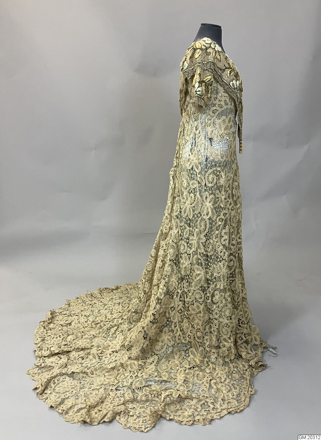 Hellång aftonklänning i virkad spets med broderi och pärldekorationer. Klänningens liv är kortärmat, V-ringat med knäppning mitt bak med hyskor och hakar. Livet är korsetterat och fodrat med bomull. Bredare bårder med tredimensionellt broderade blommor med stjälkar och blad i silke och guldfärgad metalltråd längs med urringningen och bårderna överlappar varandra mitt fram och mitt bak. Samma bårder utgör även de korta ärmarna. Både urringning och ärmar avslsutas med frans av gula glaspärlor. Hellång kjol med långt släp i virkad spets som går upp i spets mitt fram och visar underkjolen i ljusgrönt siden som är broderad med blomor och insekter i samma teknik. Mitt fram hänger två långa sidenband som avslutas med tofs av pärlfrans.