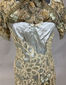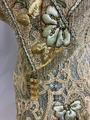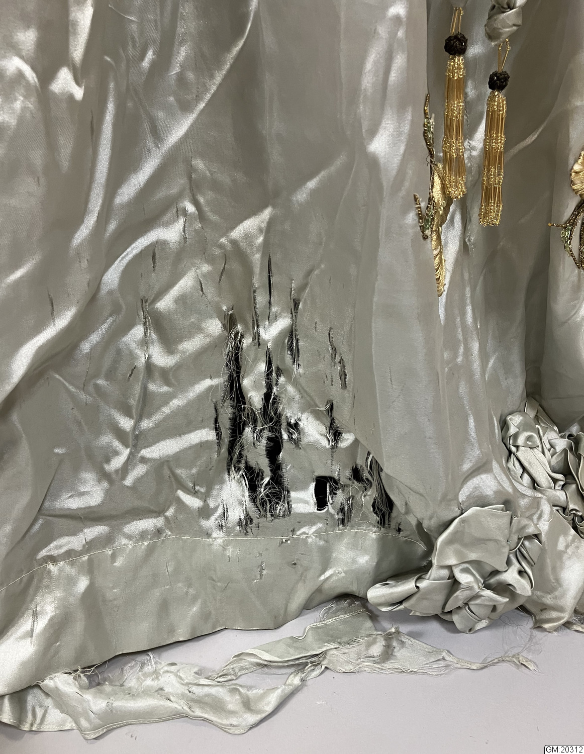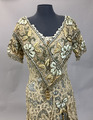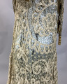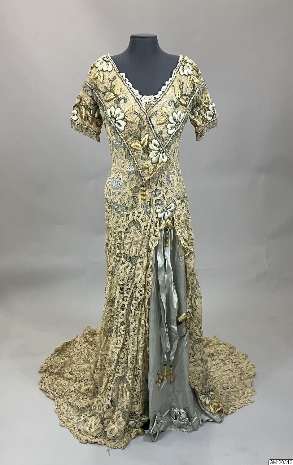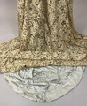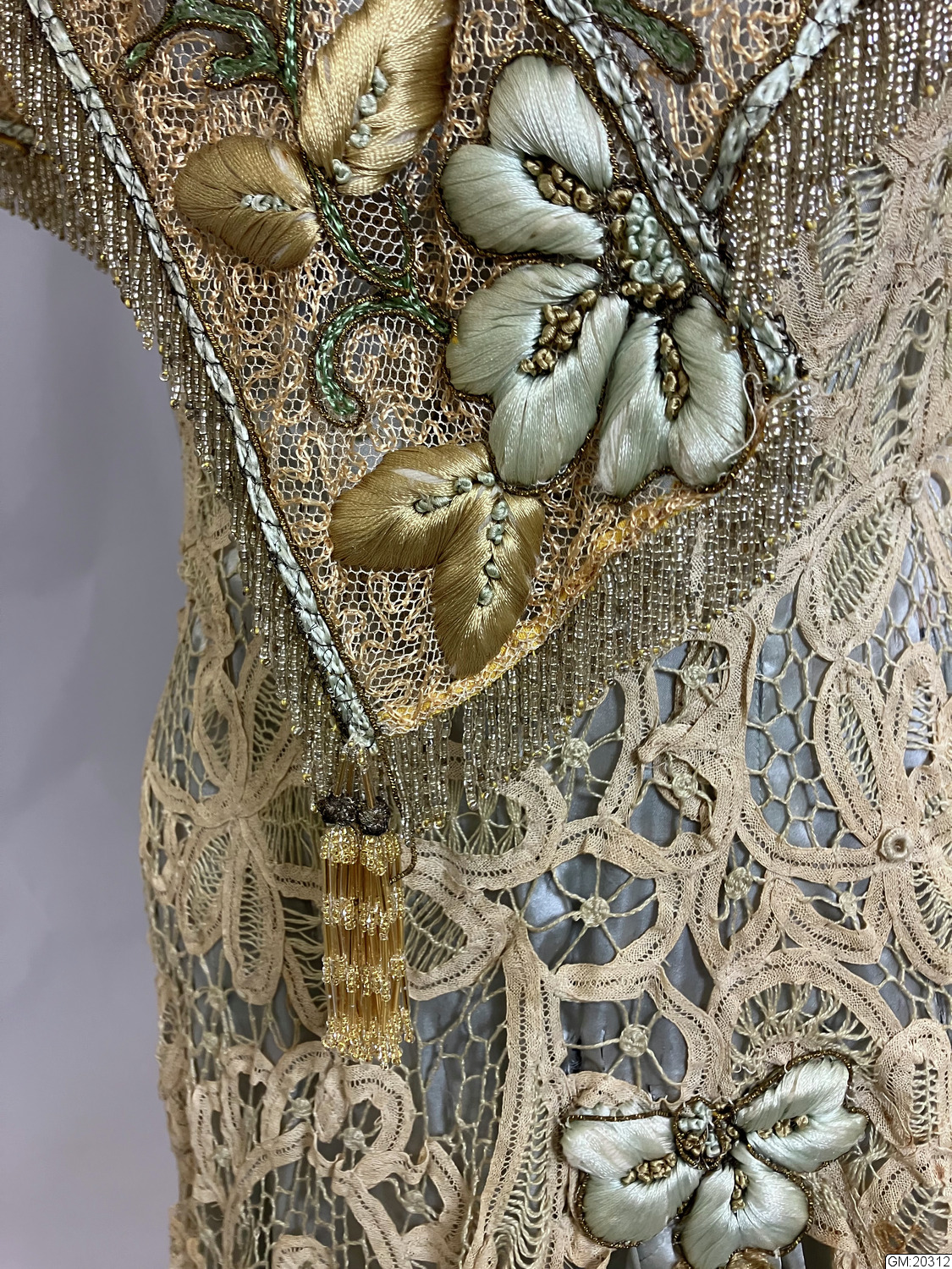 Hellång aftonklänning i virkad spets med broderi och pärldekorationer. Klänningens liv är kortärmat, V-ringat med knäppning mitt bak med hyskor och hakar. Livet är korsetterat och fodrat med bomull. Bredare bårder med tredimensionellt broderade blommor med stjälkar och blad i silke och guldfärgad metalltråd längs med urringningen och bårderna överlappar varandra mitt fram och mitt bak. Samma bårder utgör även de korta ärmarna. Både urringning och ärmar avslsutas med frans av gula glaspärlor. Hellång kjol med långt släp i virkad spets som går upp i spets mitt fram och visar underkjolen i ljusgrönt siden som är broderad med blomor och insekter i samma teknik. Mitt fram hänger två långa sidenband som avslutas med tofs av pärlfrans.