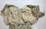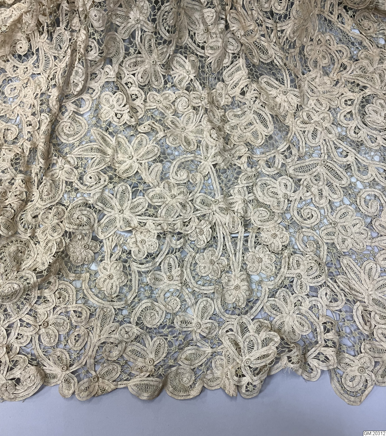 Hellång aftonklänning i virkad spets med broderi och pärldekorationer. Klänningens liv är kortärmat, V-ringat med knäppning mitt bak med hyskor och hakar. Livet är korsetterat och fodrat med bomull. B...