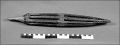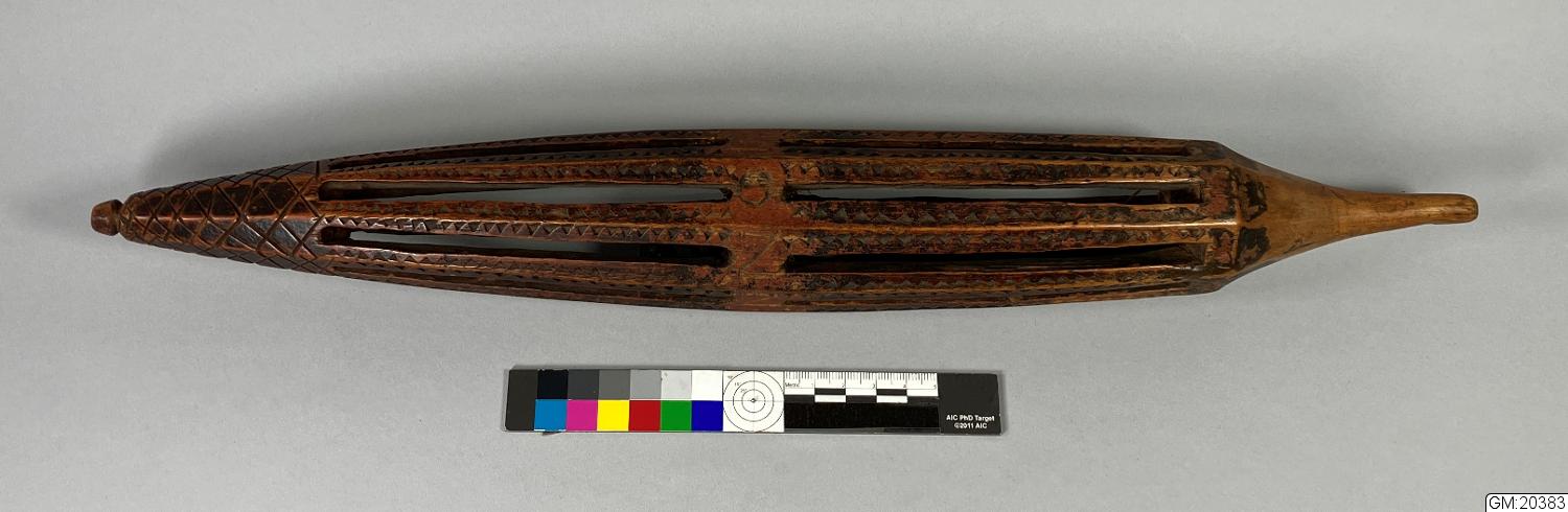 • Linfäste av trä, genombrutet; i två våningar; försedd med två träkulor; ornerat med uddsnitt, spår av röd färg. dat 1814.