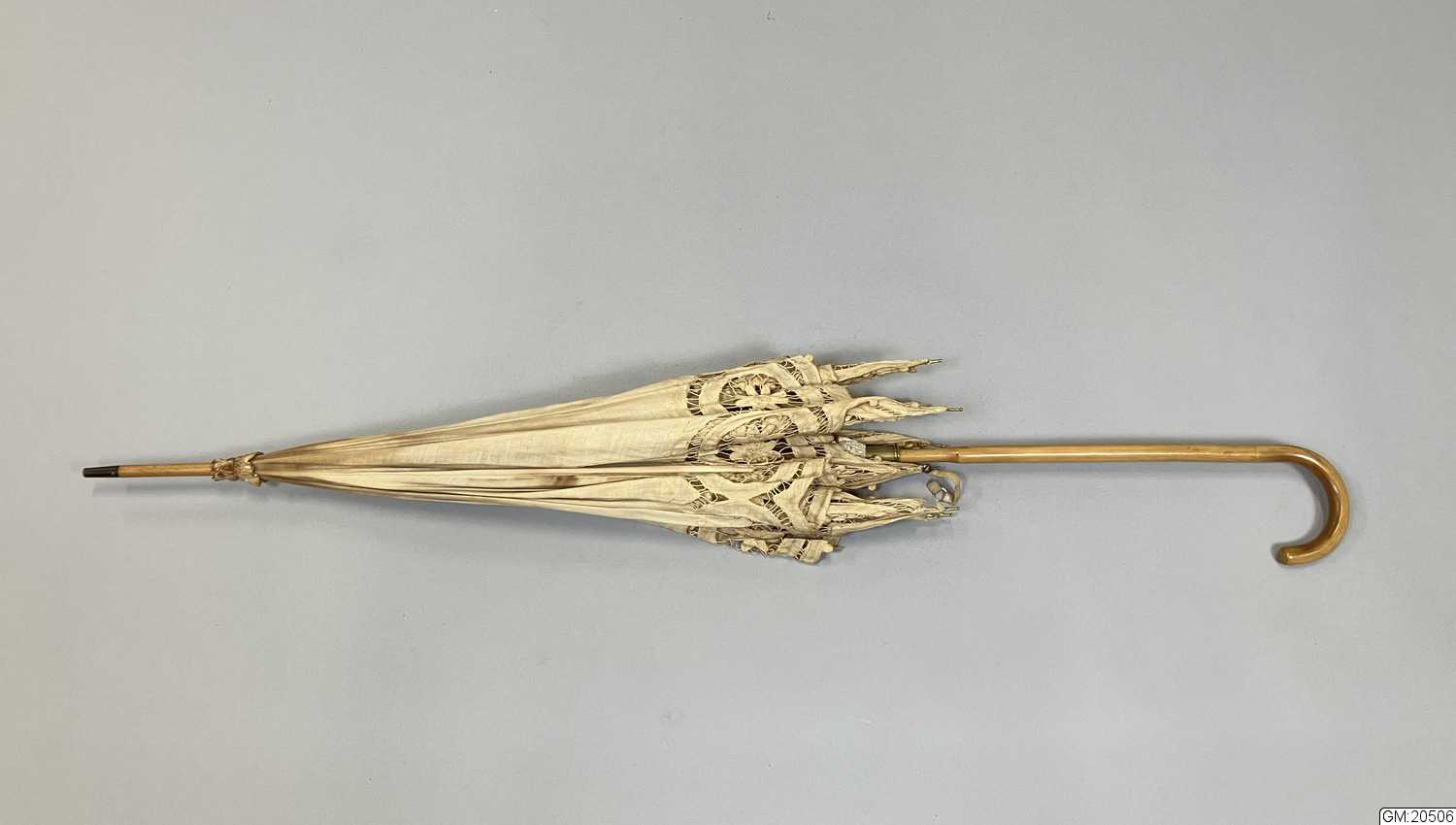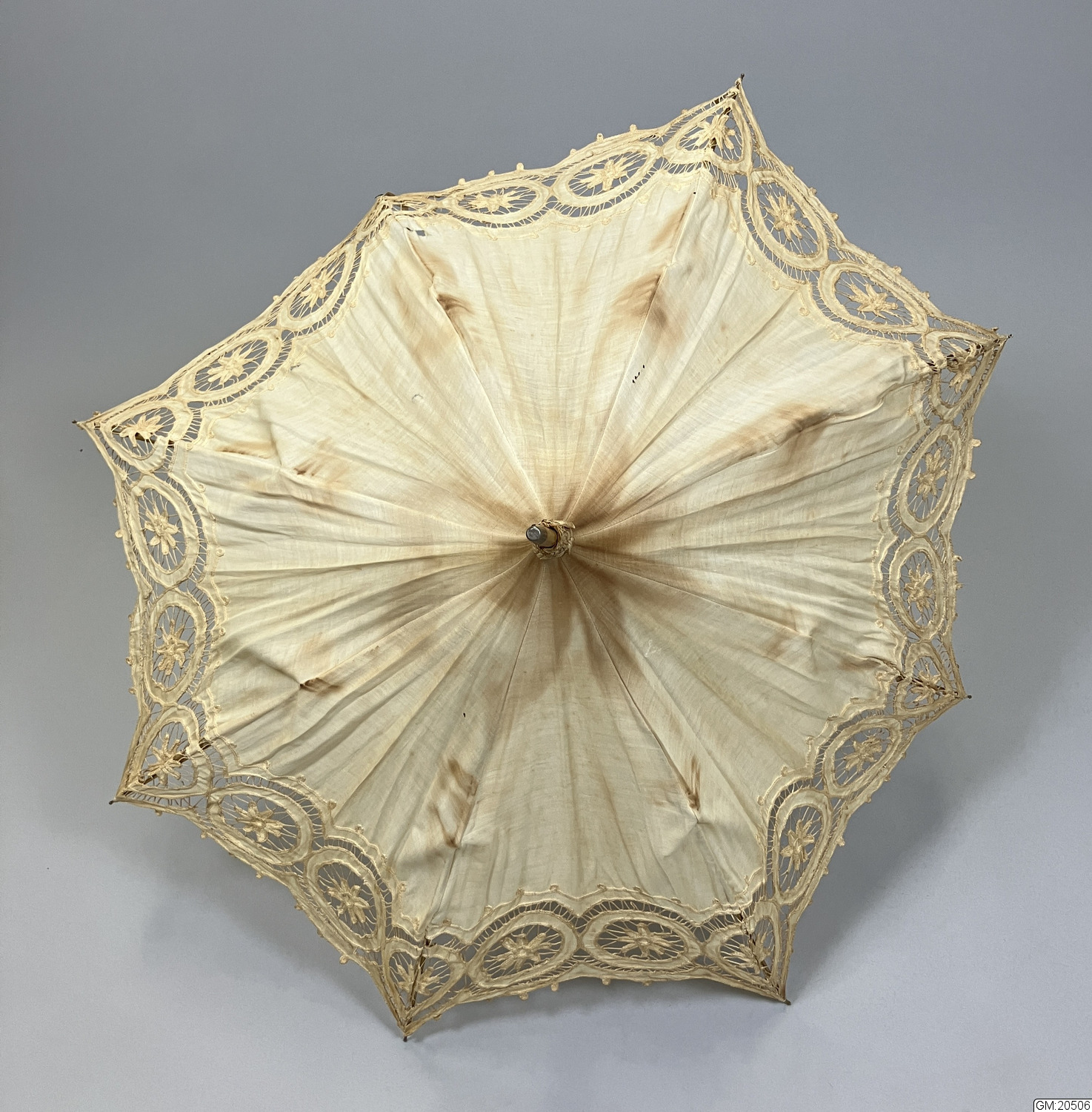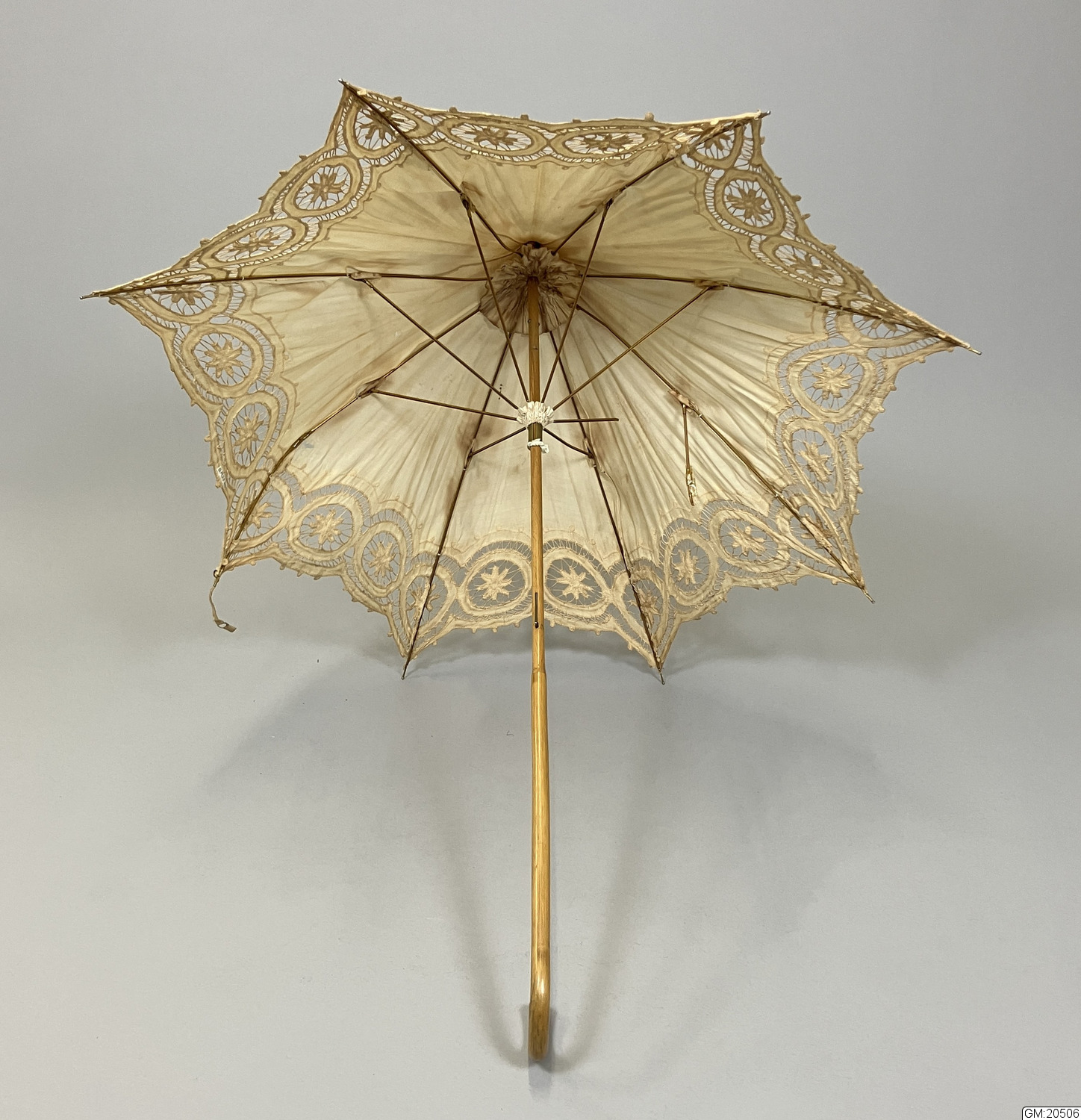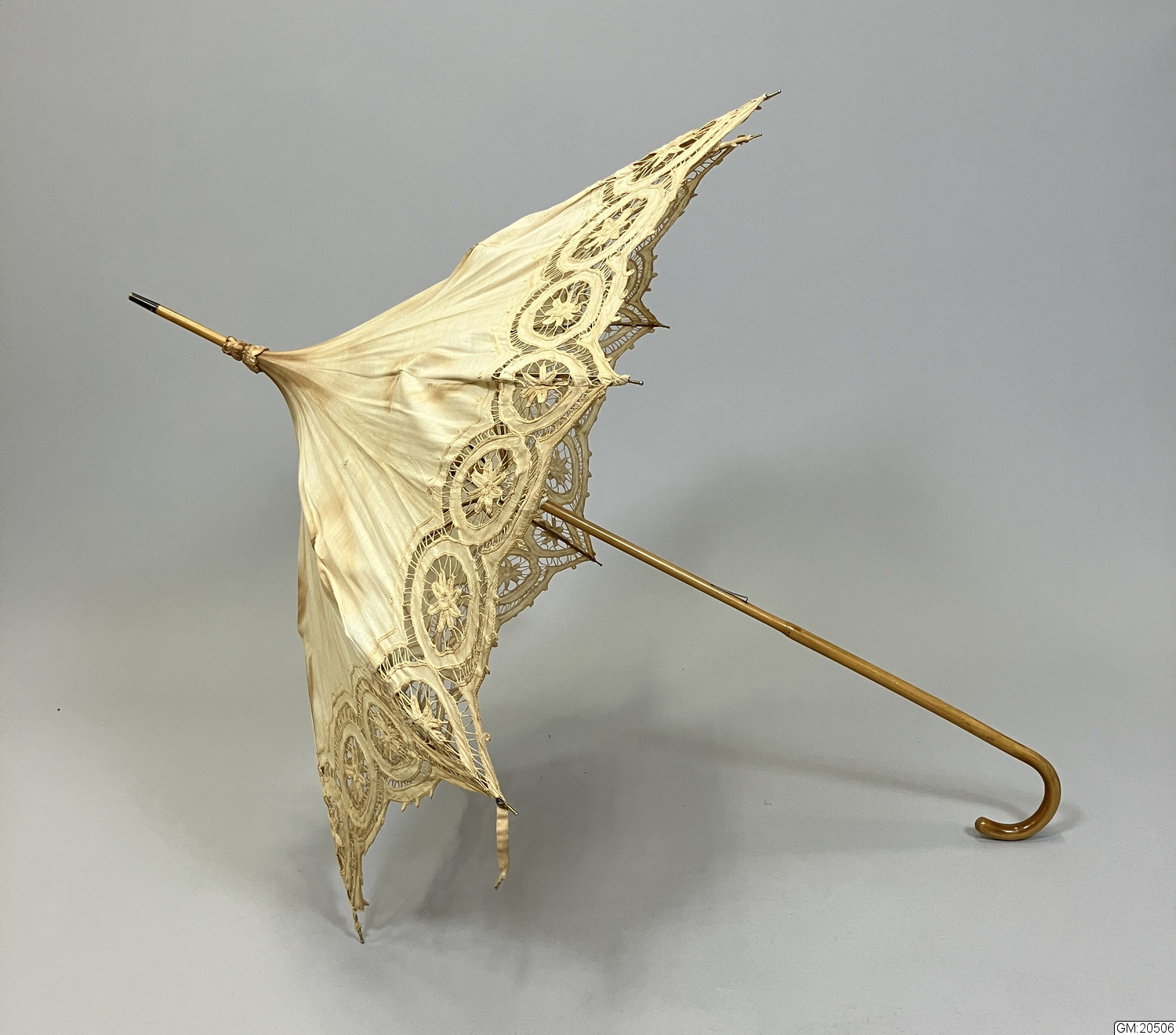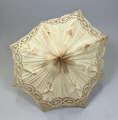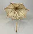 Parasoll i vitt bomullstyg med hålmönstrad sydd spets, bomullstyget är gulnat. Stomme i metall och trä. Skaft av trä med böjt handtag. Parasollet hålls ihop i nedfällt läge av ett band med metallring.