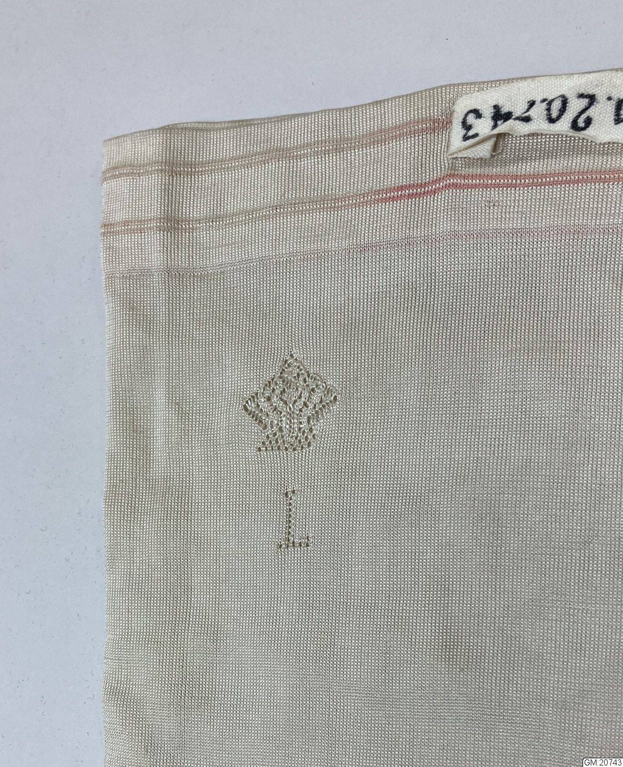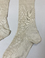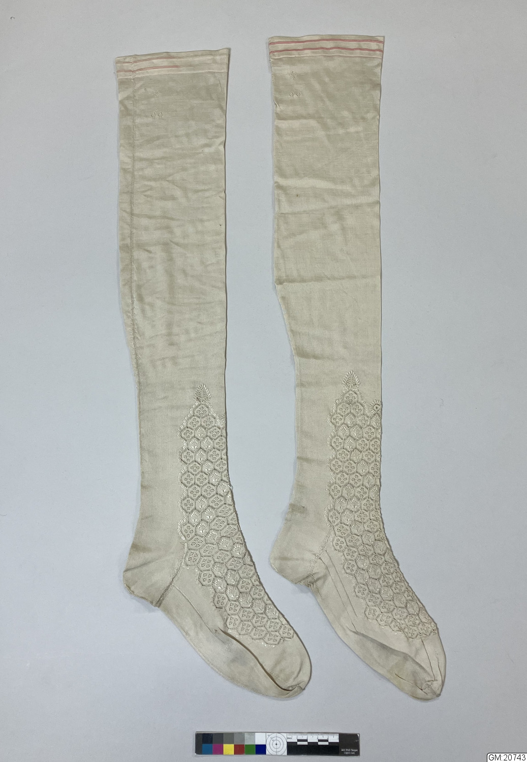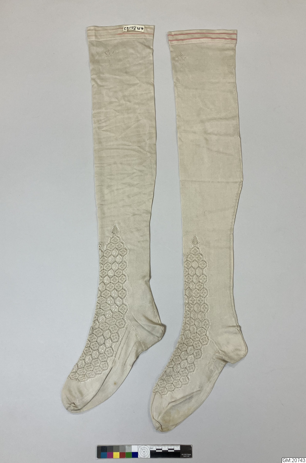 • Ett par gråvita silkesstrumpor med spetsmönster på vristen. Strumporna är märkta med hålmönster med en krona över ett L samt siffrorna 4 och 60.