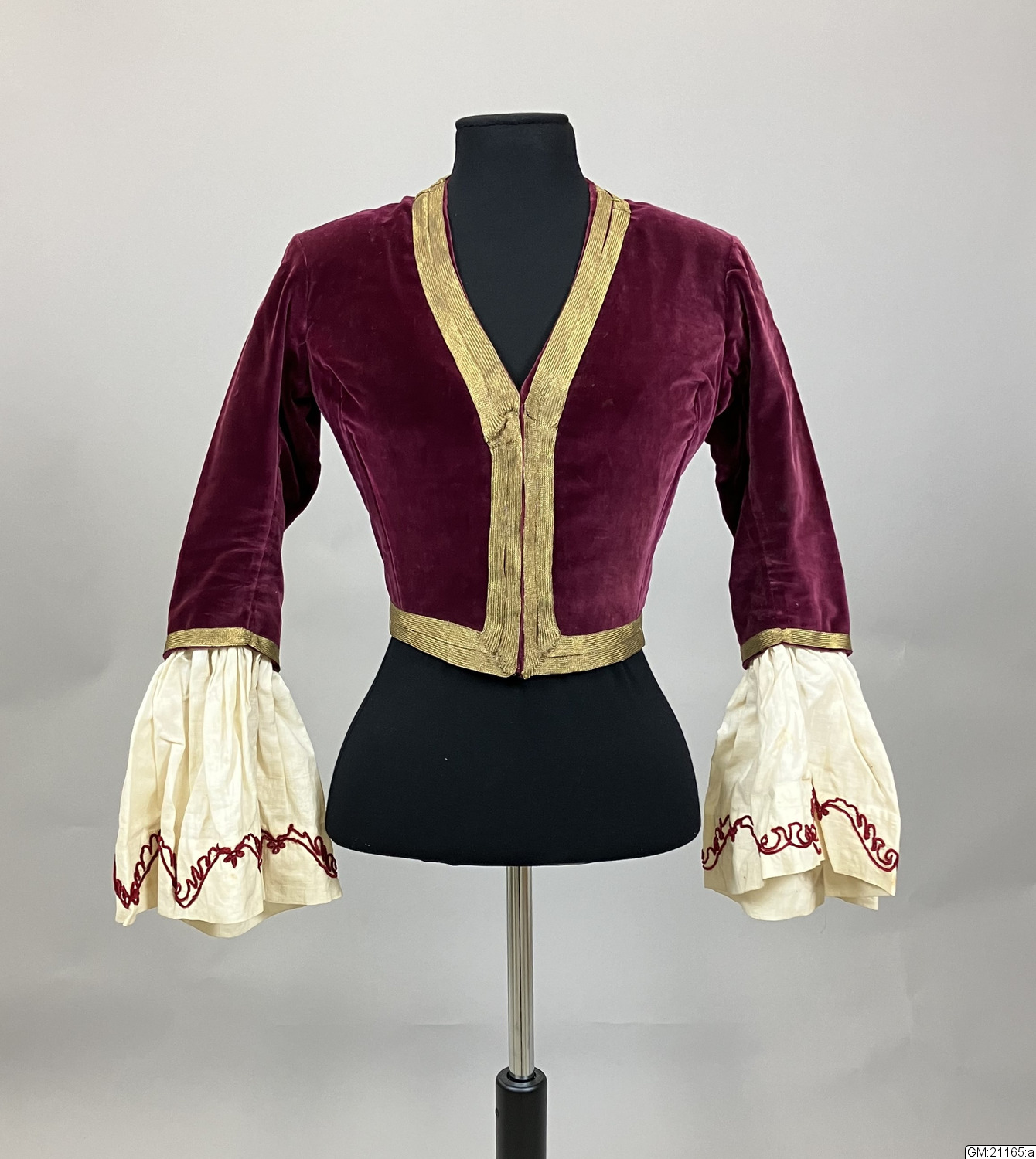 • Klänningsliv med tillhörande huvudbonad i vinröd sammet. Eventuellt en maskeradkostym.