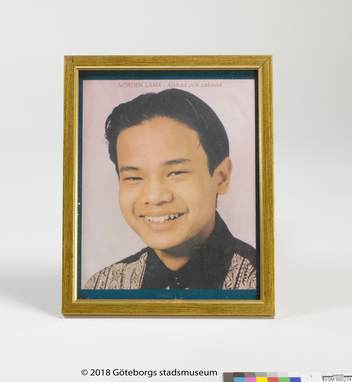 Inramat foto med text. Text: NORDEN LAMA - Älskad och saknad Ingår i de insamlade föremålen, bilderna och texterna från den minnesplats som uppstod utanför brandlokalen november 1998.