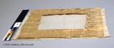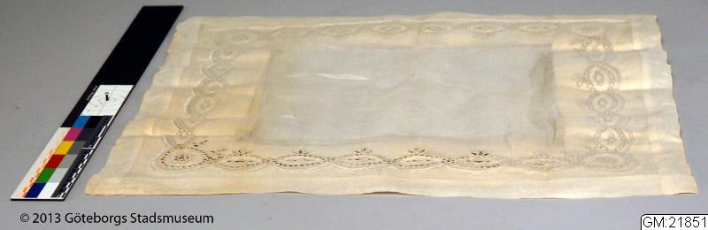 En duk i vitbroderi som ej är färdig. Därför kan man se hur sådana vitbroderier syddes, Mönstret är ritat med brunt bläck på vitt papper, för att göra mönsterpappret stadigt har det tråcklats samman med flera lager tidningspapper, innan duken som skulle broderas tråcklades fast överst. Tyget i duken är tunnt och därför lyser mönsterritningen igenom, och gick att följa medan man sydde broderiet. G...