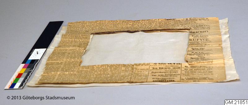 En duk i vitbroderi som ej är färdig. Därför kan man se hur sådana vitbroderier syddes, Mönstret är ritat med brunt bläck på vitt papper, för att göra mönsterpappret stadigt har det tråcklats samman med flera lager tidningspapper, innan duken som skulle broderas tråcklades fast överst. Tyget i duken är tunnt och därför lyser mönsterritningen igenom, och gick att följa medan man sydde broderiet. Gunilla Andersson oktober 2013