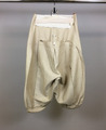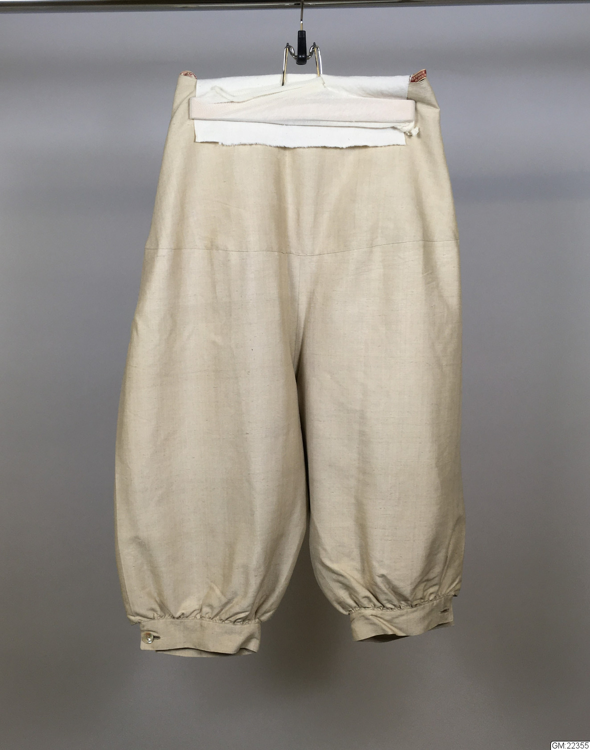 Från katalogkort: Sportbyxa för dam av shantung, fodrade med vitt siden. Med två lagda veck på framstycket och ett motveck på bakstycket, är byxorna sydda till en 20-23 cm bred, något rundad linning eller gördel. Denna knäppes bak med knappar och knapphål. Sprund i sidorna med knäppning. Linning vid knäet med knapp och knapphål. Två hängband med firmanamn: Nordiska kompaniet, Stockholm. Längd: 80 cm.