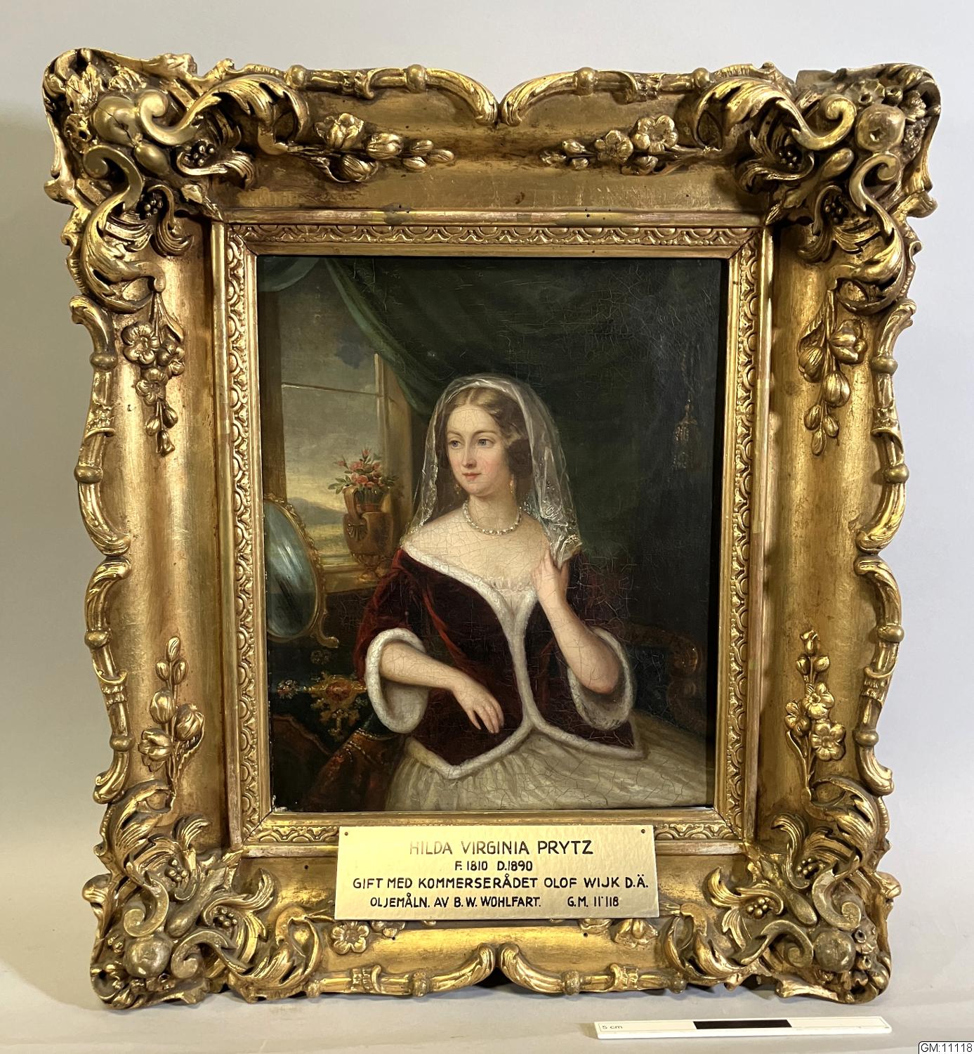 "Porträtt av fru Hilda Wijk född Prytz, ”kallad den blåögda”. Oljemålning, knäbild. På baksidan inskriften: ”Ritratto S:ta Hilma Wijk In nomine Deo et Salvatorem meum! Wilhelm Wohlfart Gothenburgensis...