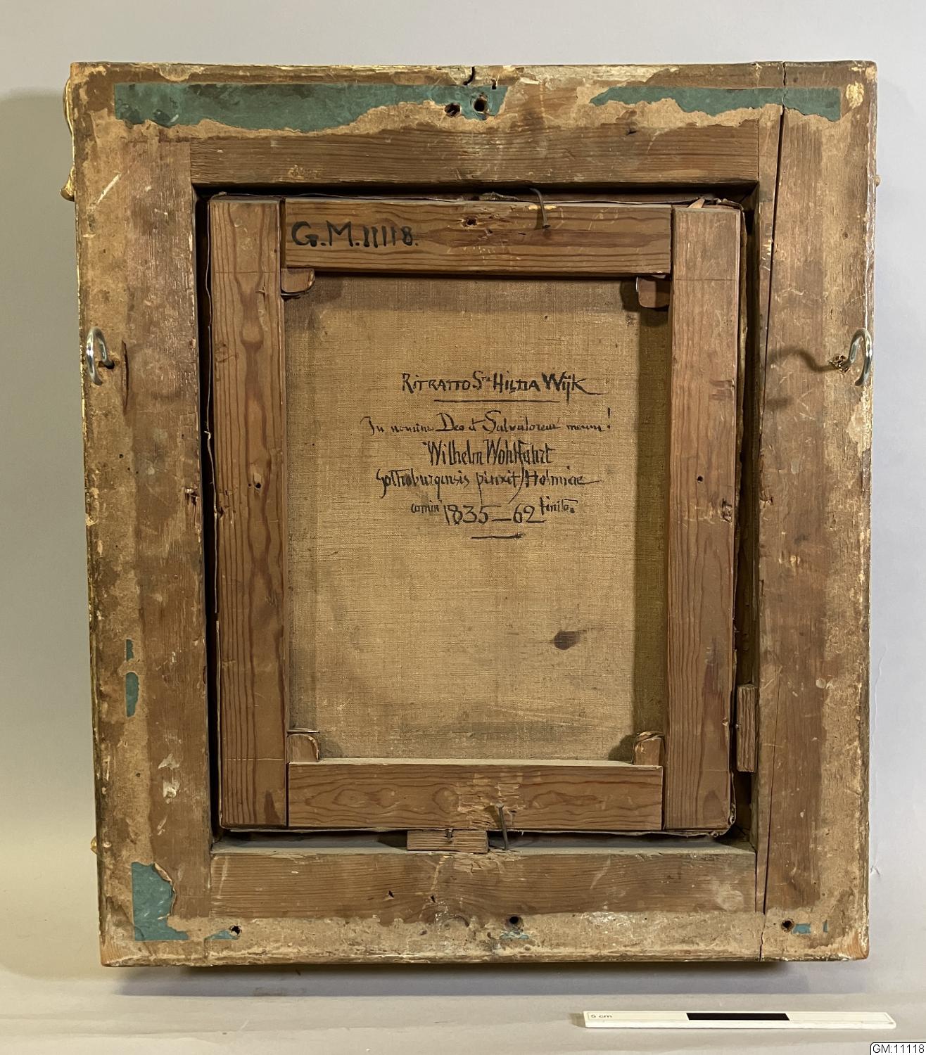 "Porträtt av fru Hilda Wijk född Prytz, ”kallad den blåögda”. Oljemålning, knäbild. På baksidan inskriften: ”Ritratto S:ta Hilma Wijk In nomine Deo et Salvatorem meum! Wilhelm Wohlfart Gothenburgensis pinxit Holmiae comin/?/ 1835-1862 finito.” Inskriften i översättnng: Porträtt av Signora Hilma Wijk/./ I Guds och min Frälsares namn! Göteborgaren Wilhelm Wohlfart målat i Stockholm med början 1835, avslutat 1862. Anm. ’ritratto’, italienska för ’porträtt’. ”I Guds och min Frälsares nam” skall nog kopplas till konstnären, att han målade det i Guds och Frälsarens år 1862./Kristina Söderpalm, 2022-01-11