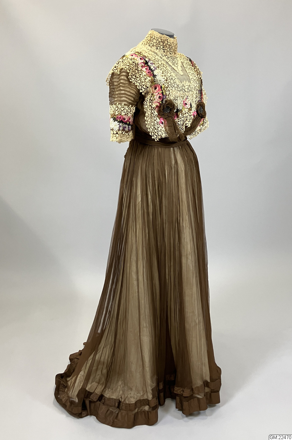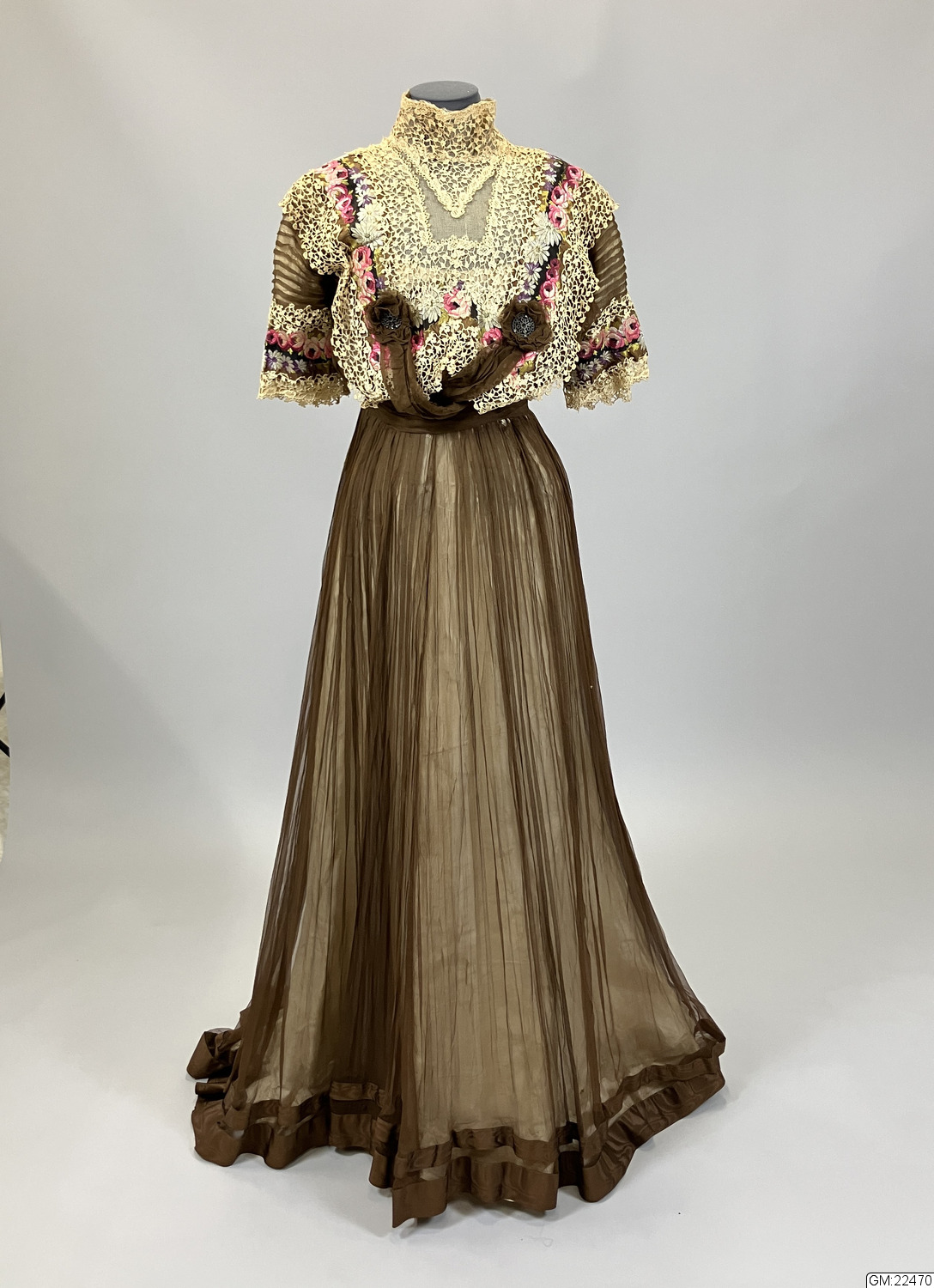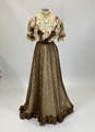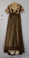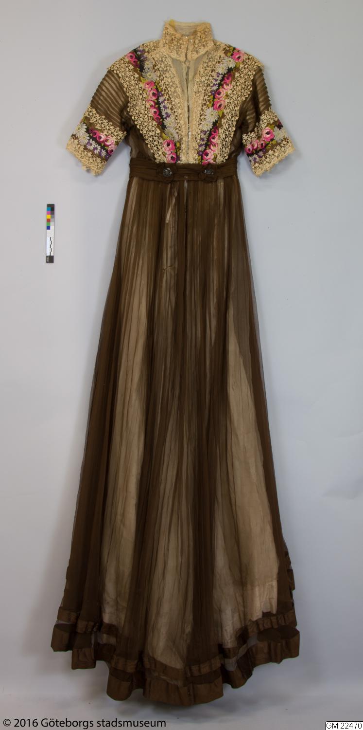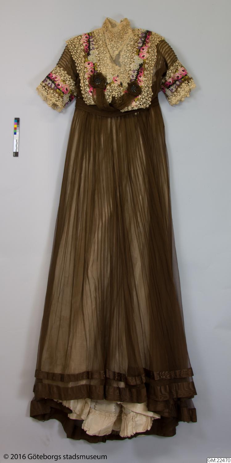 Från katalogkort: Klänning i kimonoform, sydd av brun plissérad volie. Breda bårder med broderi av silke i flera färger och cremefärgade spetsremsor garnerar livet. Ståndkrage av spets vilken fortsätter en bit ner på isättningen av gles tyll. På livets fram- och bakstycke garnering av brun veckad volie lagd i kryss och avslutad med en kokard i vars mitt fästats ett spänne av glittrande stenar. Skärp av tyget, bak lagt i kryss och på så sätt bildande ryggens garnering. Foderliv- och underkjol av taft. Mellan taftkjol och överkjol vit chiffon, även i livet och ärmen. Längd bak: 170 cm, längd fram: 152 cm, vidd: 463 cm. Band i midjan med firmamärke från Augusta Lundin, Stockholm.