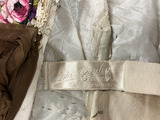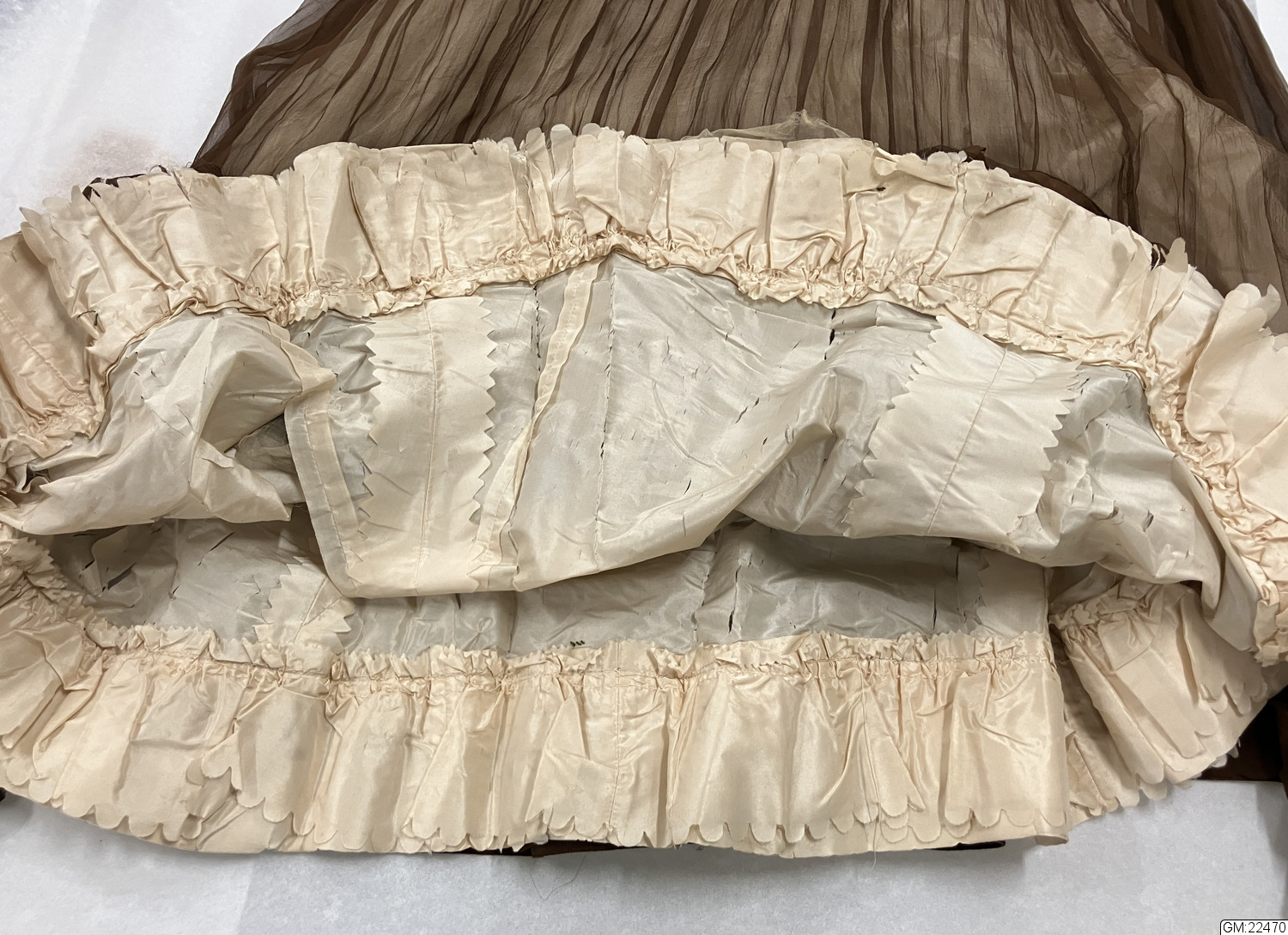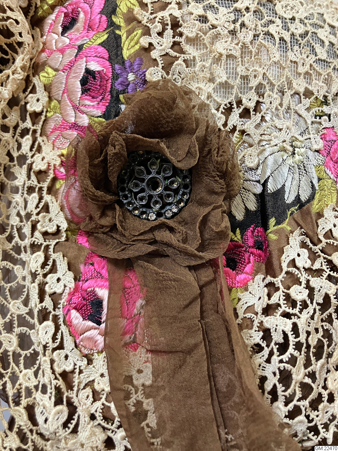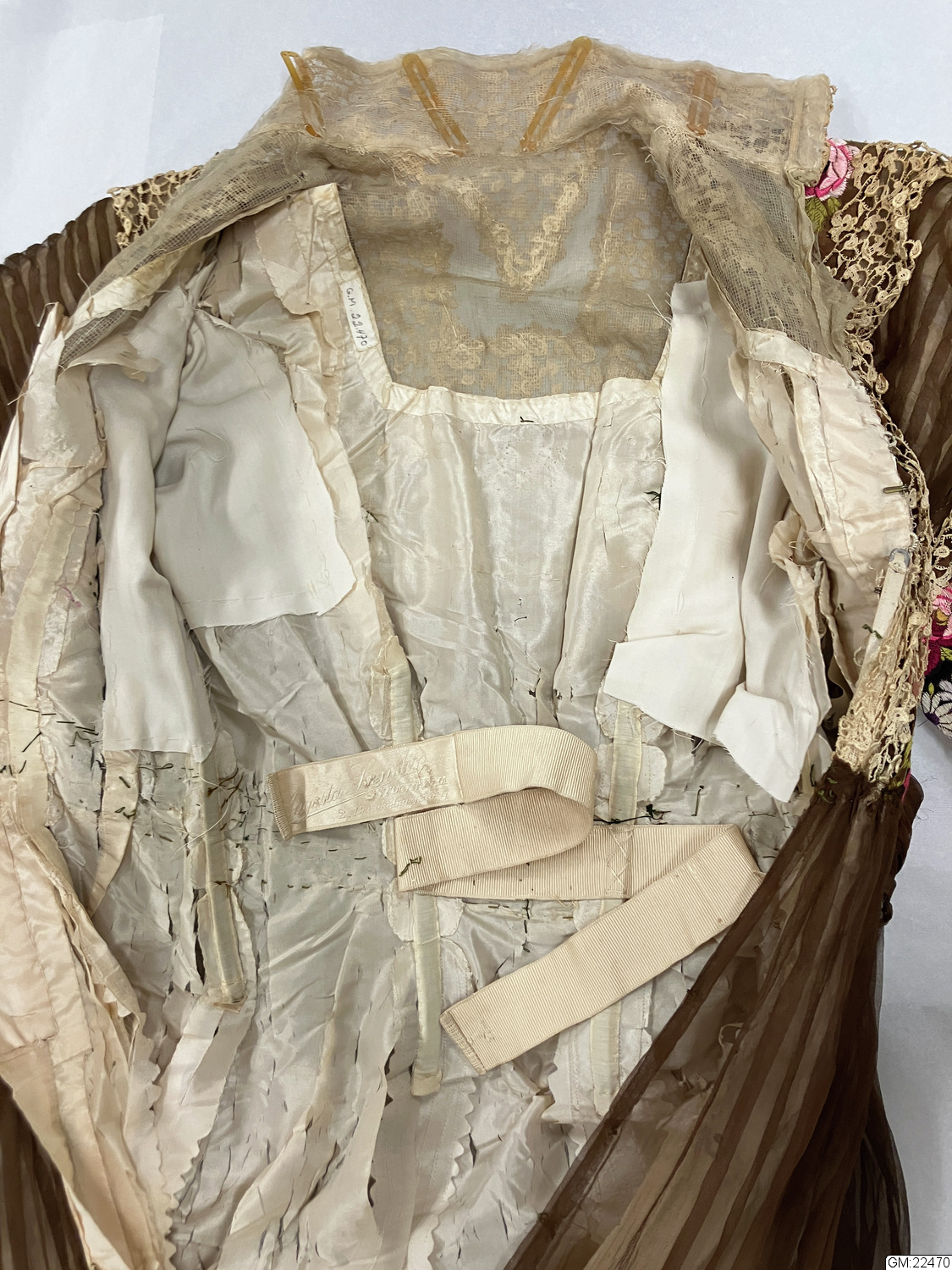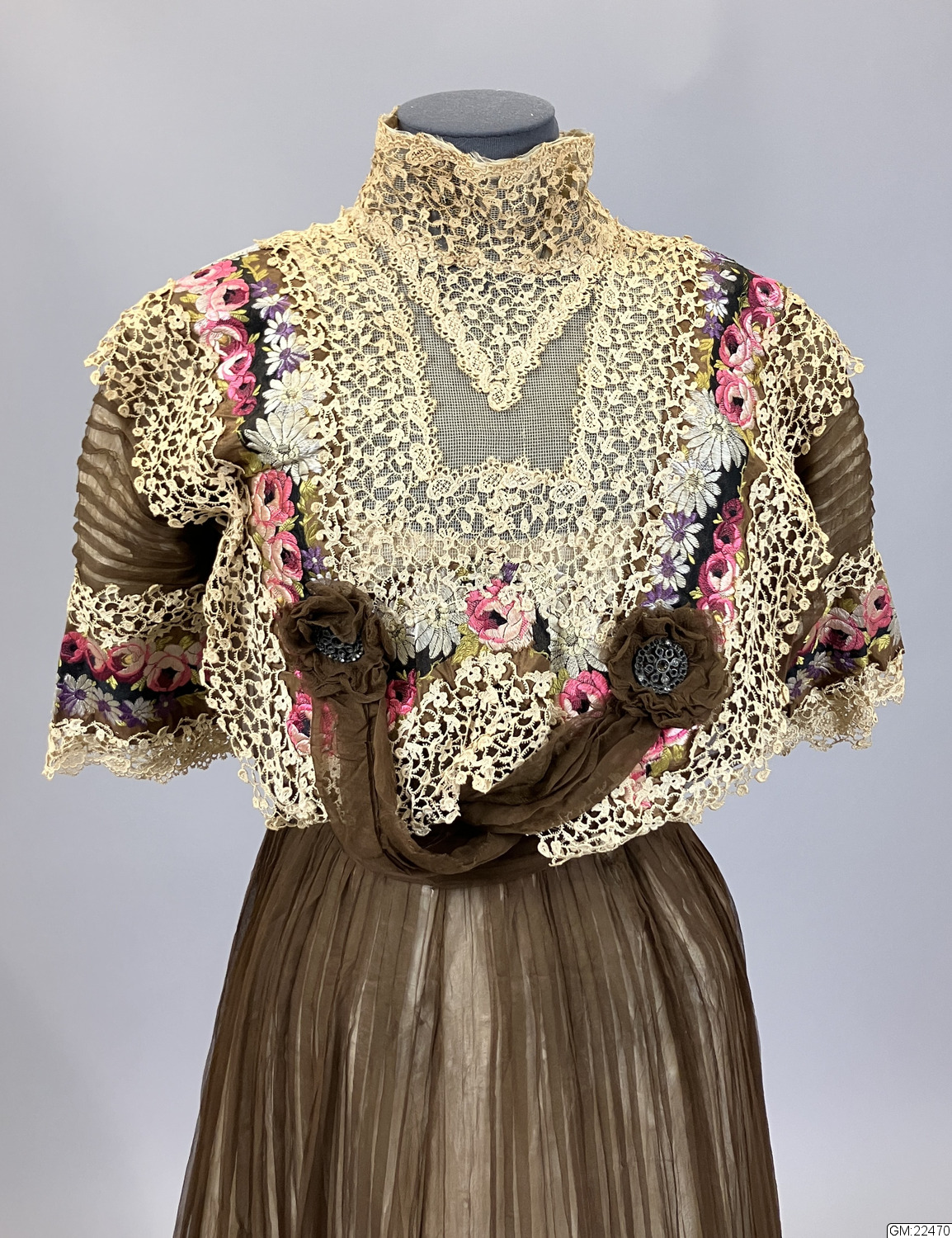 Från katalogkort: Klänning i kimonoform, sydd av brun plissérad volie. Breda bårder med broderi av silke i flera färger och cremefärgade spetsremsor garnerar livet. Ståndkrage av spets vilken fortsätter en bit ner på isättningen av gles tyll. På livets fram- och bakstycke garnering av brun veckad volie lagd i kryss och avslutad med en kokard i vars mitt fästats ett spänne av glittrande stenar. Skärp av tyget, bak lagt i kryss och på så sätt bildande ryggens garnering. Foderliv- och underkjol av taft. Mellan taftkjol och överkjol vit chiffon, även i livet och ärmen. Längd bak: 170 cm, längd fram: 152 cm, vidd: 463 cm. Band i midjan med firmamärke från Augusta Lundin, Stockholm.