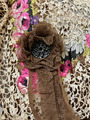 Från katalogkort: Klänning i kimonoform, sydd av brun plissérad volie. Breda bårder med broderi av silke i flera färger och cremefärgade spetsremsor garnerar livet. Ståndkrage av spets vilken fortsät...