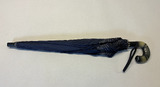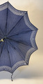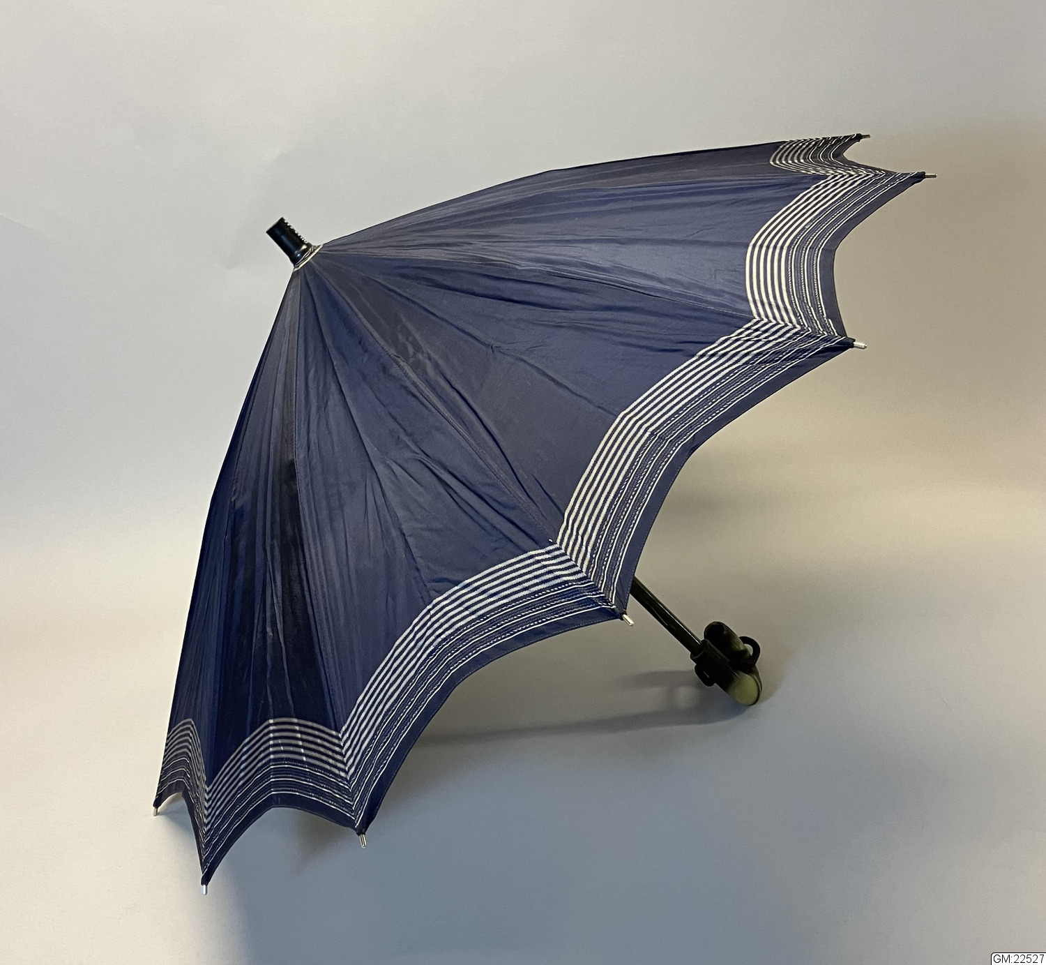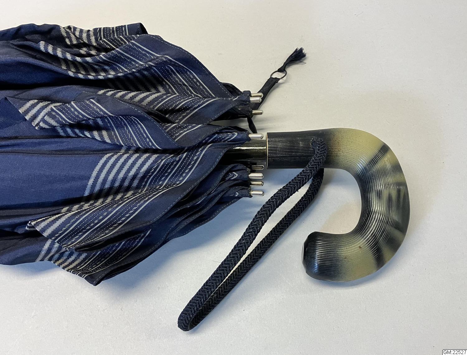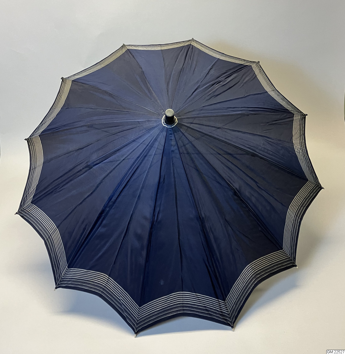 Paraply i mörkblått tättvävd siden (syntet?) med vita ränder i ytterkanten. Stomme i trä och metall. Böjt handtag i marmorerad celluloid. Parasollet har ett band för att hålla ihop det i nedfällt läge som fästs med knapp och metallring. På handtaget sitter en handrem i blått snörmakeri.