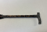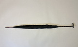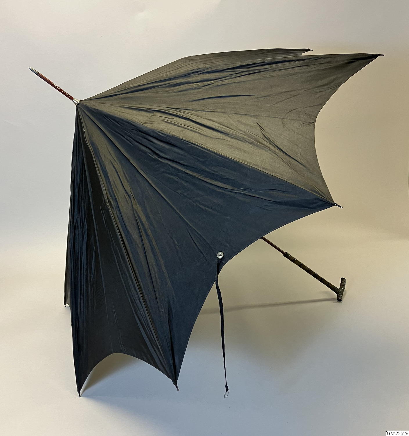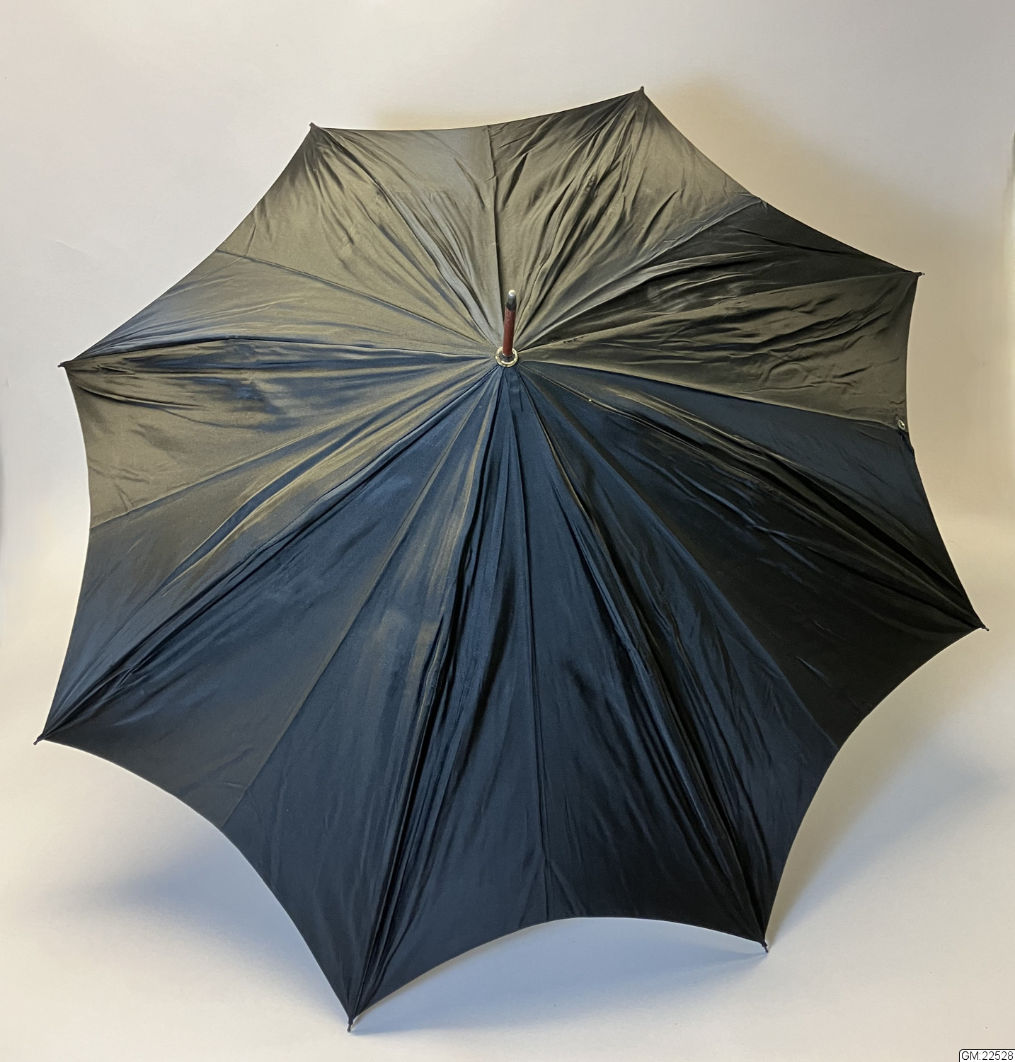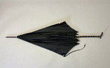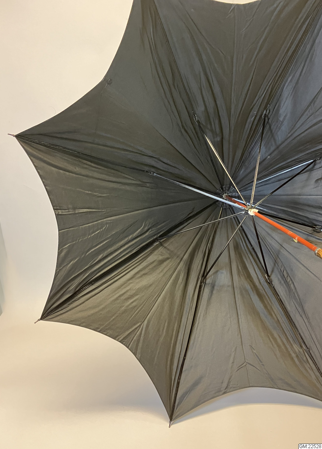 Paraply i svart siden. Stomme i metall. Handtag i ådringsmålat trä (bambu?) med krycka av metall med strukturmönster av bladslingor. Långsmal topp metall. Parasollet har en snodd för att hålla ihop det i nedfällt läget som fästs med knapp och ring.