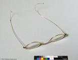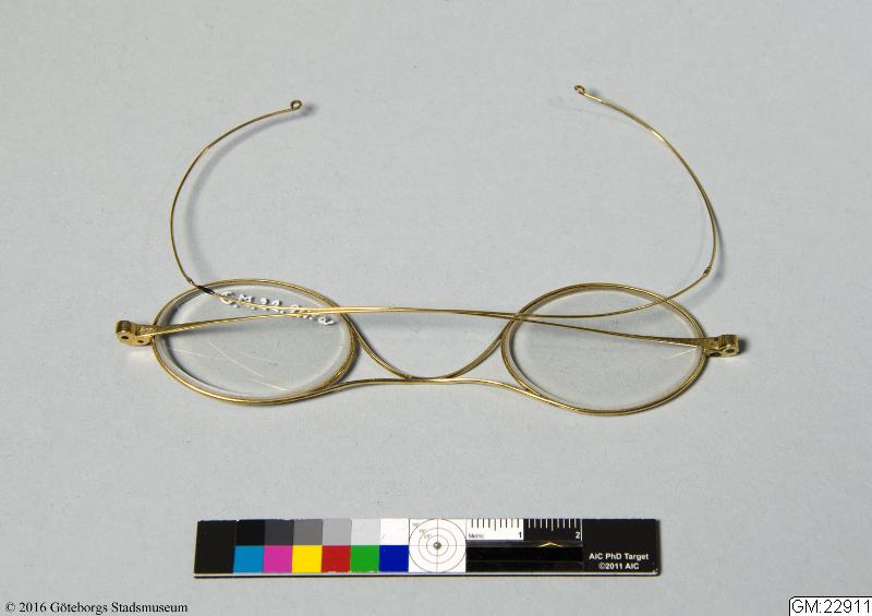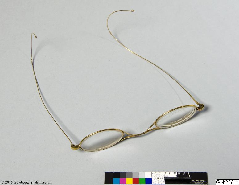 Glasögon med ovala glas 3,6 x 2,5 cm, i tunna gulmetallbågar. Fodral av pappa, klätt med schackmönstrat svart papper. På fodralet står skrivet "Pappas glasögon". De bör ha tillhört rektor Hans Ferdinand Hult, f. 1828, d. 1908, Halmstad, fru Anna Hedéns fader. 13 x 4,3 cm = fodralet. [enl katalogkort]