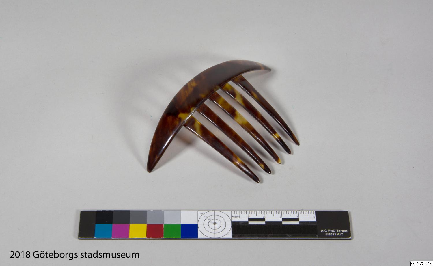 Tortoise decorative hair comb, a long oval, ends slightly pointed, with five teeth extending from the middle. Uncertain dating, one suggested date is 1860-70. But the comb hasn’t got any obvious time ...