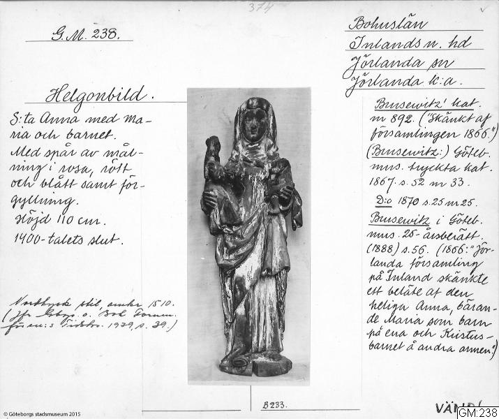 • Brusewitz� i Göteborg mus. 25-årsberätt (1888) s. 56 (1856: "Jörlanda församling på Inlands skänkte ett beläte af den heliga Anna, bärande Maria som barn på ena och Kristusbarnet å andra armen")