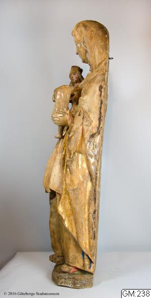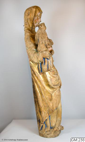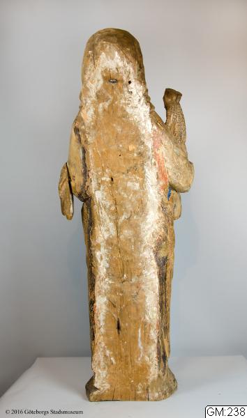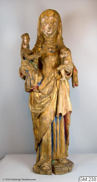 Ämnet till skulpturen är taget ur en halverad stock av ljust lövträ, björk eller lind med minsta diameter 550mm.Baksidan är inte urholkad utan endast delvis planhuggen,den råa ytan efter splittring av stocken är synlig på flera ställen.Skulpturen är skuren i ett stycke med undantag av den klädnadsflik som draperats över Annas vänstra arm,vilken skurits för sig och fixerats vid huvudst...