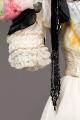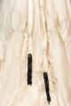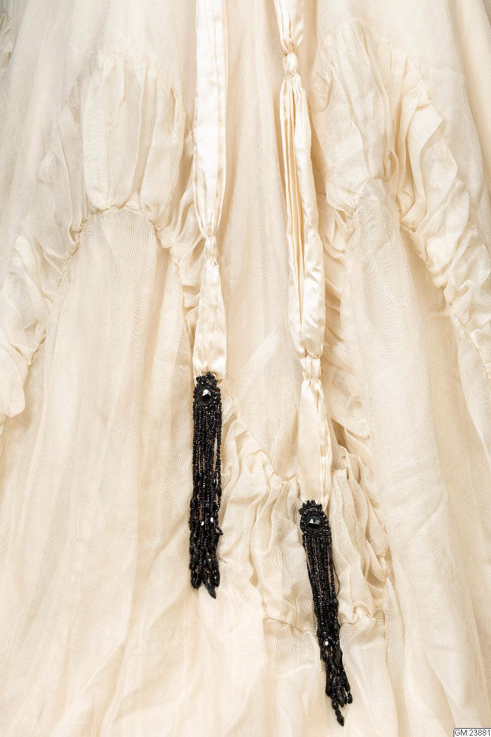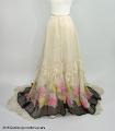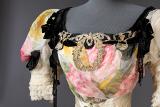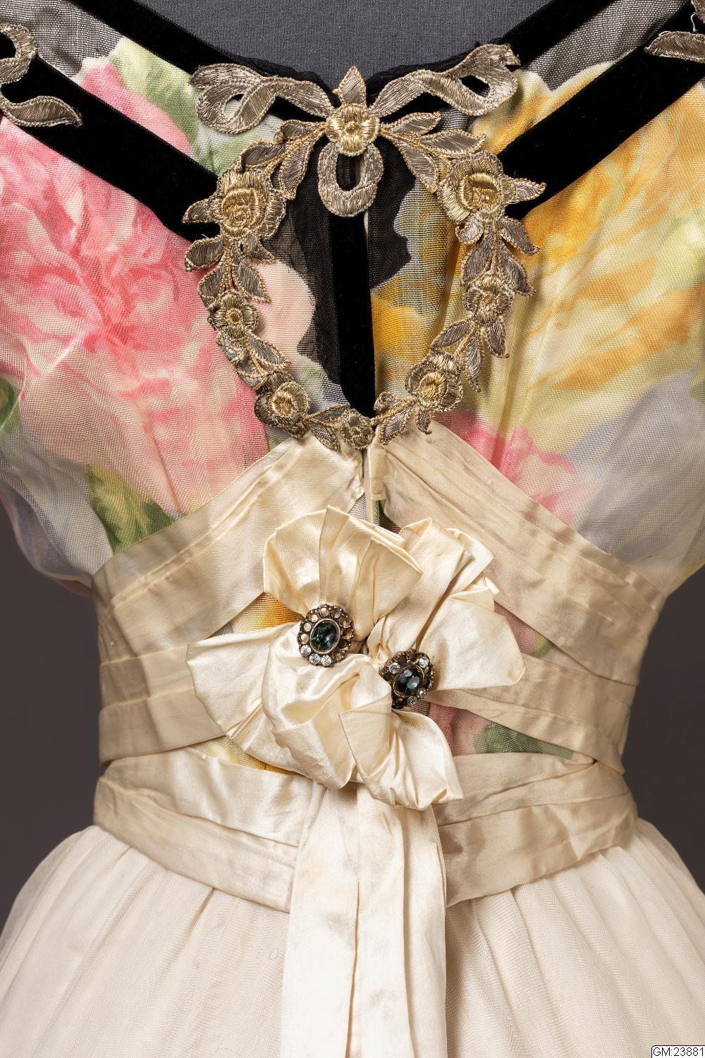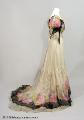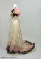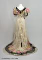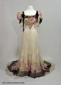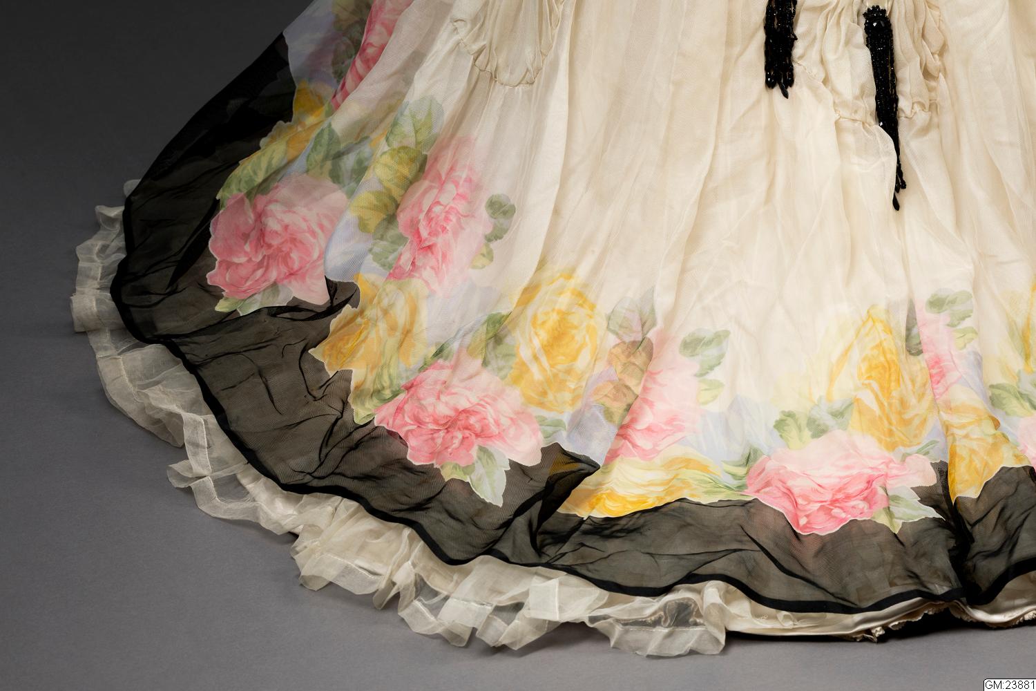 Från katalogkort: Klänning. Liv av vit atlas med draperat övertyg av etaminetyp med rosmönster i gult, ljusblått och rosa på vit botten. Dragsko i linningen. Halsringningen kantad med svart tyg av etamninetyp samt svarta sammetsband samt band av guld- och silvertråd med blommönster. Mitt fram och mitt bak en blomsterkrans. Svarta sammetskokarder mes passmenterier av svarta stenkolspärlor. Livet g...