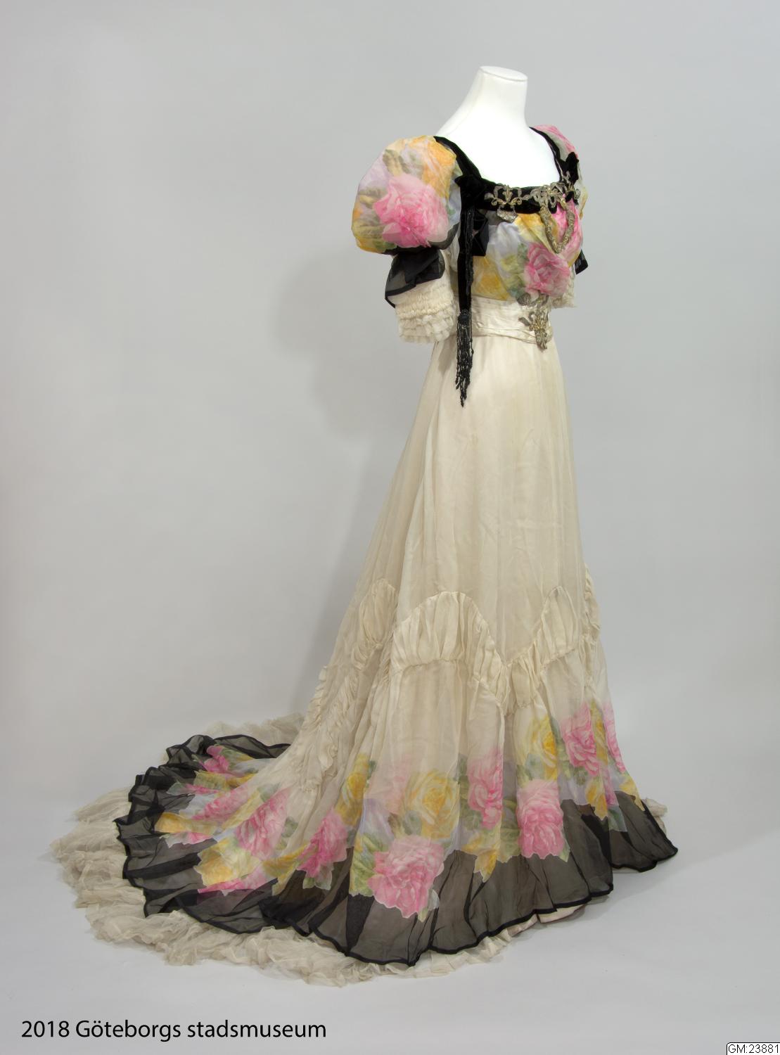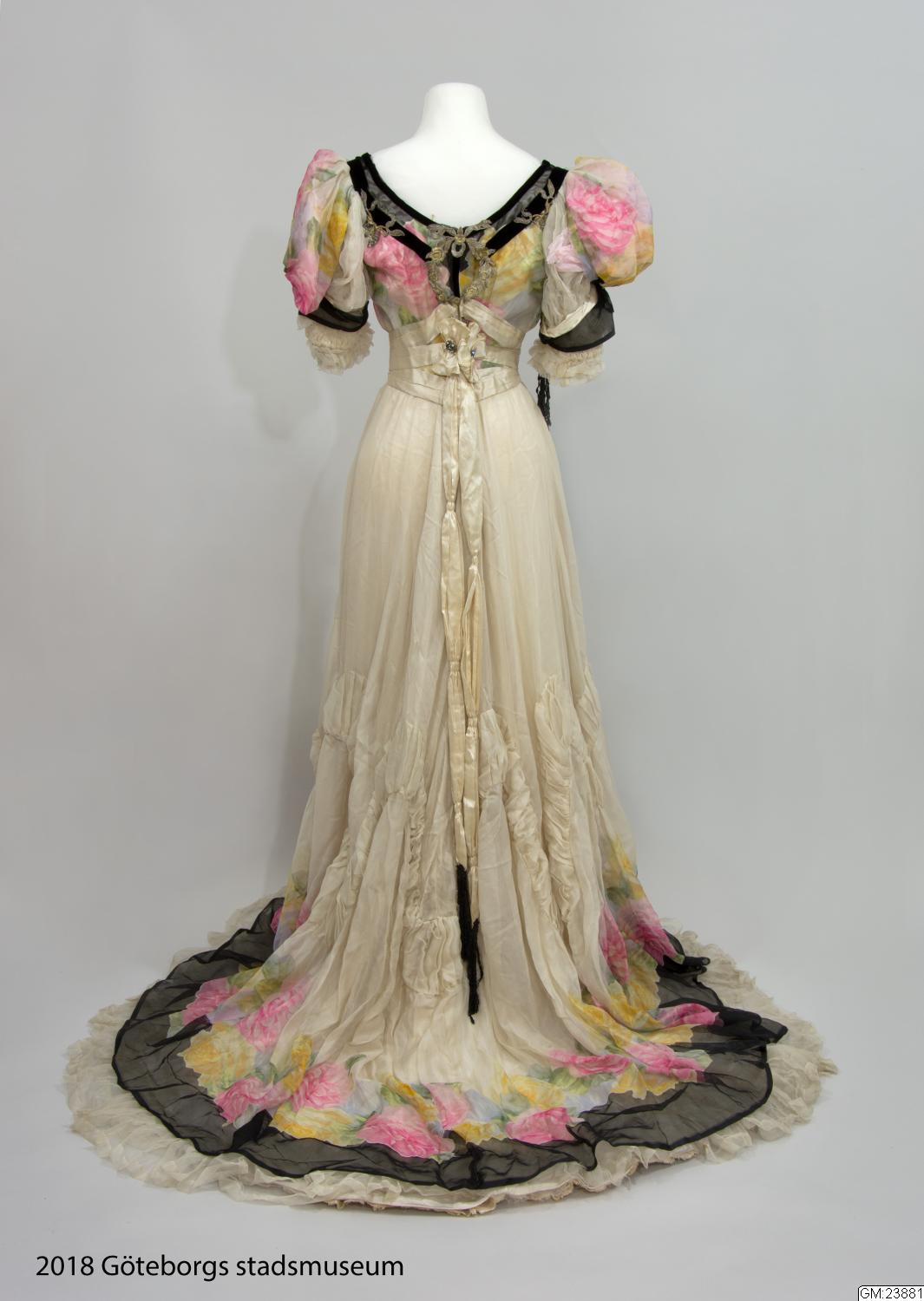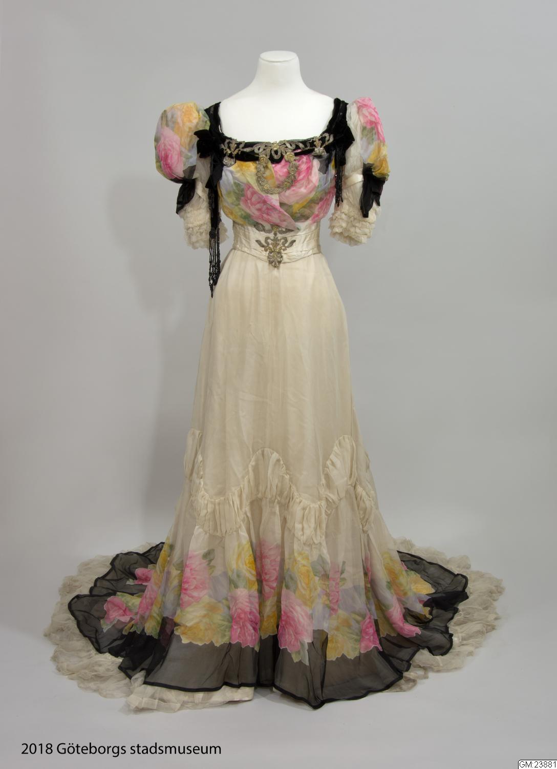 Från katalogkort: Klänning. Liv av vit atlas med draperat övertyg av etaminetyp med rosmönster i gult, ljusblått och rosa på vit botten. Dragsko i linningen. Halsringningen kantad med svart tyg av etamninetyp samt svarta sammetsband samt band av guld- och silvertråd med blommönster. Mitt fram och mitt bak en blomsterkrans. Svarta sammetskokarder mes passmenterier av svarta stenkolspärlor. Livet går framtill ner i en snibb. Nederkanten dekorerad med tre rader draperade atlasband. Mitt fram dekorerad med ett motiv av guld- och silvertråd. Knäppes i ryggen med 9 hyskor och hakar. Ärm i armbågslängd. Puffärm av vit atlas, chiffong samt det rosenmönstrade tyget. Vitt atlasband. Nederärmar av rynkad vit chiffong. Foderliv av vitt bomullstyg med 11 fjädrar. Livband med ljusblå text. Göteborg Henric Ahlberg Modemagasin. (---) Kjol av vit chiffong med dubbel volang. Överkjol av vitt tyg av etaminetyp med rosenbård och svart bård i nederkanten. 4 våder. Ovanför blomsterbården ett i båda sidor rynkat rysch påsytt i vågor. Knäppes i ryggen med 8 hyskor och hakar. Skärp av draperad vit atlas. Ändarna fastsydda på livets rygg. Två rosetter med strassbroscher. Skärpet omlottlagt i ryggen. Knytes framtill. Ändarna ganrerade med passmenterier av svarta stenkolspärlor. Liv längd: 39 cm, Överkjol l. framtill: 108 cm, bak: 160 cm. Enligt givarinnans uppgift sydd år 1906 (i oktober) hos Henric Ahlbergs syateljé. Till klänningen bars guldskor och gula strumpor. Håret högt uppsatt prydd med en rosett av små guldpaljetter samt ett uppstående vitt esprit till vänster om hårknuten. Klänningen bars på amaranterbalen 1907 och ansågs då vara den vackraste på balen. Har tillhört fru Bertha Nyström adr. Nya Eckran Långedrag.