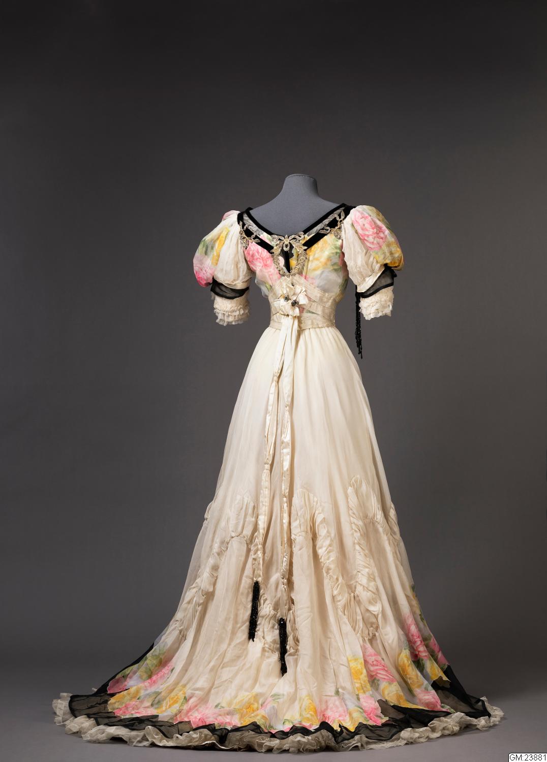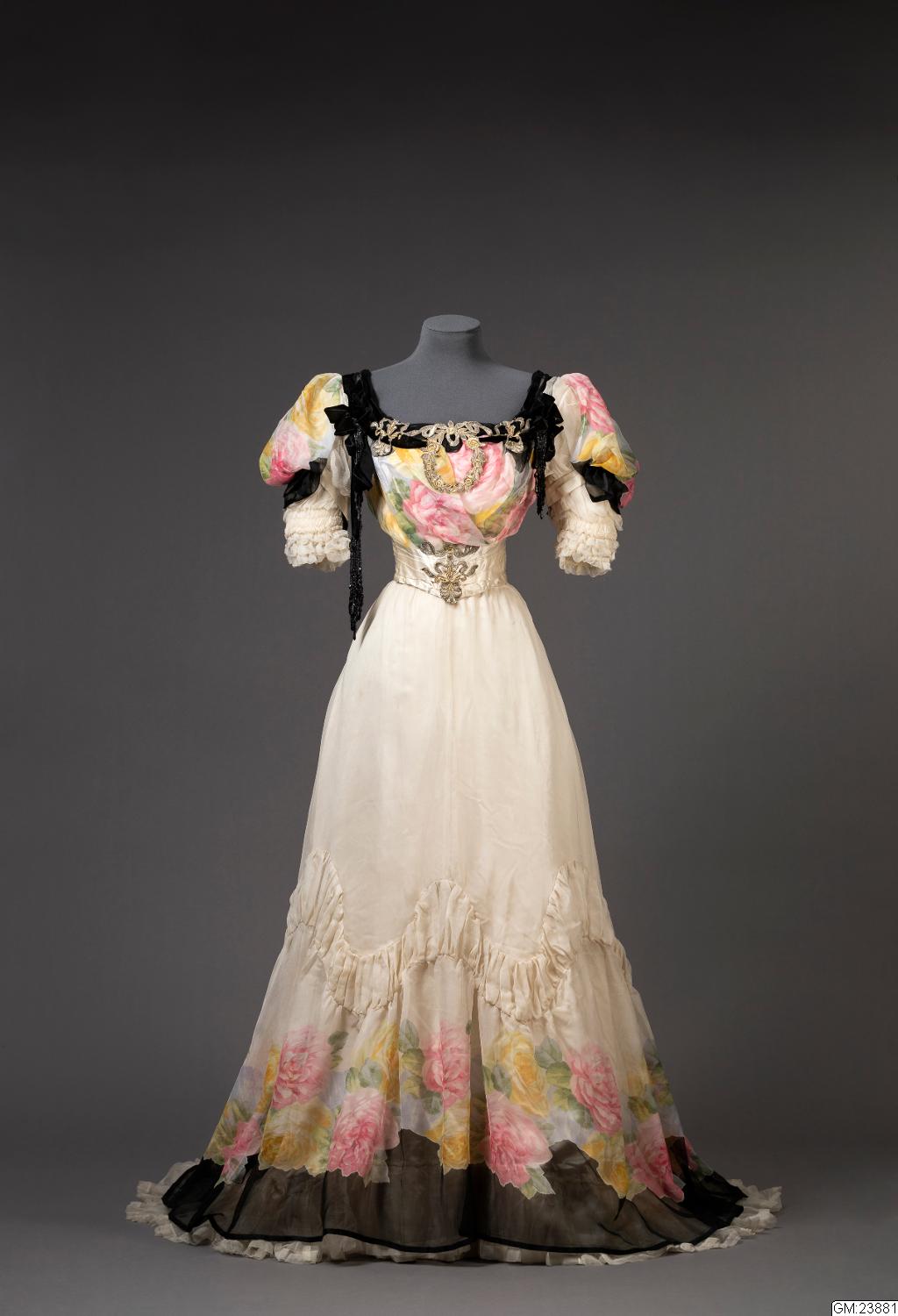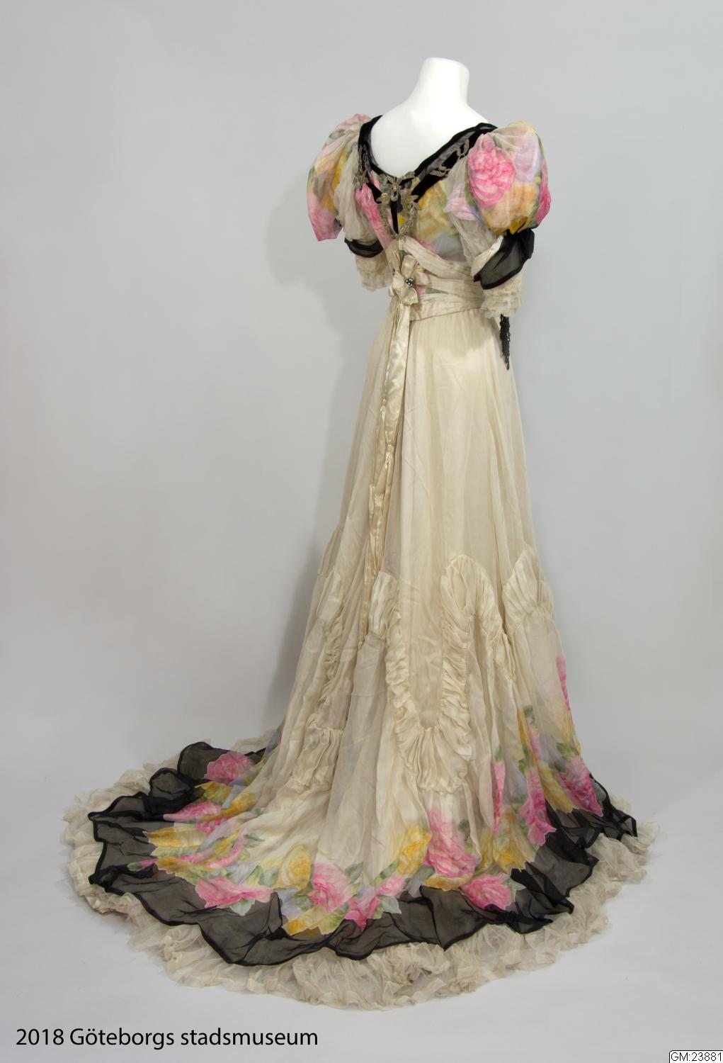 Från katalogkort: Klänning. Liv av vit atlas med draperat övertyg av etaminetyp med rosmönster i gult, ljusblått och rosa på vit botten. Dragsko i linningen. Halsringningen kantad med svart tyg av etamninetyp samt svarta sammetsband samt band av guld- och silvertråd med blommönster. Mitt fram och mitt bak en blomsterkrans. Svarta sammetskokarder mes passmenterier av svarta stenkolspärlor. Livet går framtill ner i en snibb. Nederkanten dekorerad med tre rader draperade atlasband. Mitt fram dekorerad med ett motiv av guld- och silvertråd. Knäppes i ryggen med 9 hyskor och hakar. Ärm i armbågslängd. Puffärm av vit atlas, chiffong samt det rosenmönstrade tyget. Vitt atlasband. Nederärmar av rynkad vit chiffong. Foderliv av vitt bomullstyg med 11 fjädrar. Livband med ljusblå text. Göteborg Henric Ahlberg Modemagasin. (---) Kjol av vit chiffong med dubbel volang. Överkjol av vitt tyg av etaminetyp med rosenbård och svart bård i nederkanten. 4 våder. Ovanför blomsterbården ett i båda sidor rynkat rysch påsytt i vågor. Knäppes i ryggen med 8 hyskor och hakar. Skärp av draperad vit atlas. Ändarna fastsydda på livets rygg. Två rosetter med strassbroscher. Skärpet omlottlagt i ryggen. Knytes framtill. Ändarna ganrerade med passmenterier av svarta stenkolspärlor. Liv längd: 39 cm, Överkjol l. framtill: 108 cm, bak: 160 cm. Enligt givarinnans uppgift sydd år 1906 (i oktober) hos Henric Ahlbergs syateljé. Till klänningen bars guldskor och gula strumpor. Håret högt uppsatt prydd med en rosett av små guldpaljetter samt ett uppstående vitt esprit till vänster om hårknuten. Klänningen bars på amaranterbalen 1907 och ansågs då vara den vackraste på balen. Har tillhört fru Bertha Nyström adr. Nya Eckran Långedrag.